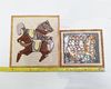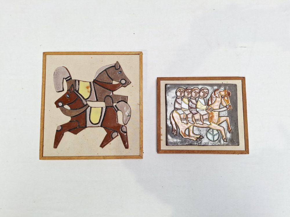 | Name: | 2 reliëftegels in houten lijst – paard & figuren, wanddecoratie |