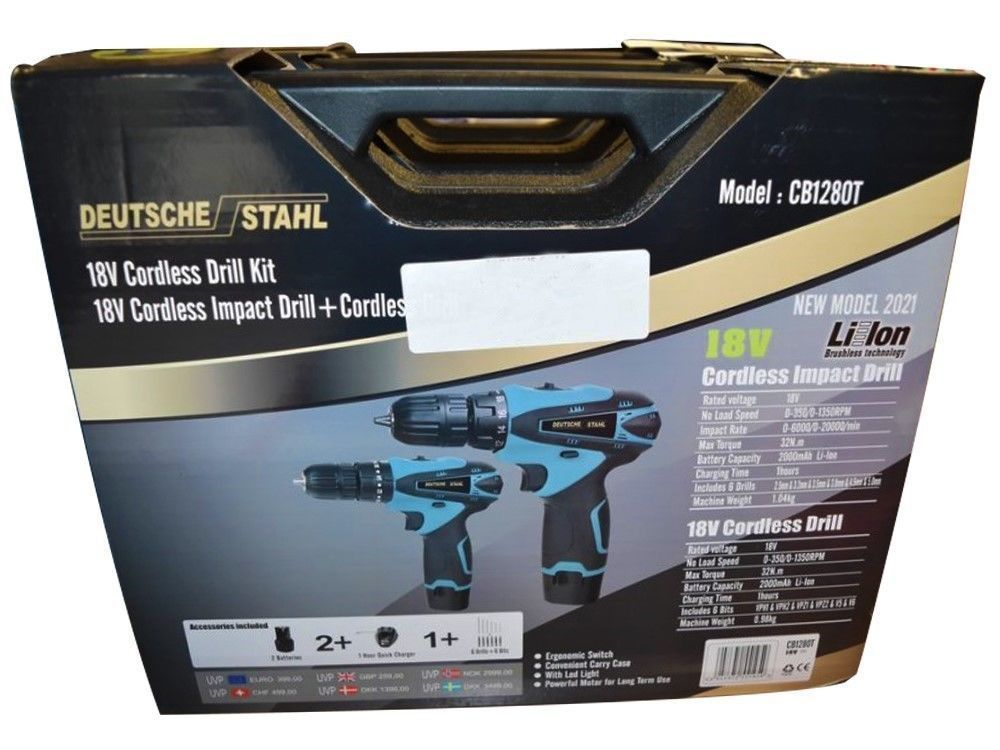 1 accu boormachineset 18V dubbele set, voorzien van litium 18 volts accu en 1 uurslader in koffer, nieuw