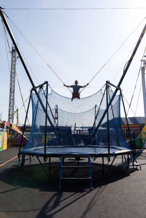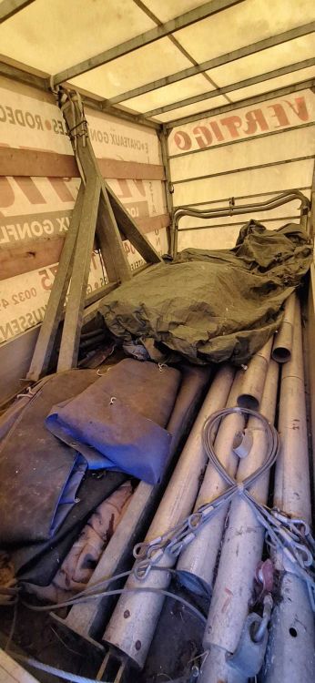 Bungee trampoline met rekkers en motor. Staat ongekend. Deze hebben we uiteindelijk nooit gemonteerd gehad. Motor aanwezig voor het optrekken van de elastieken.