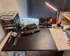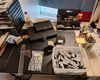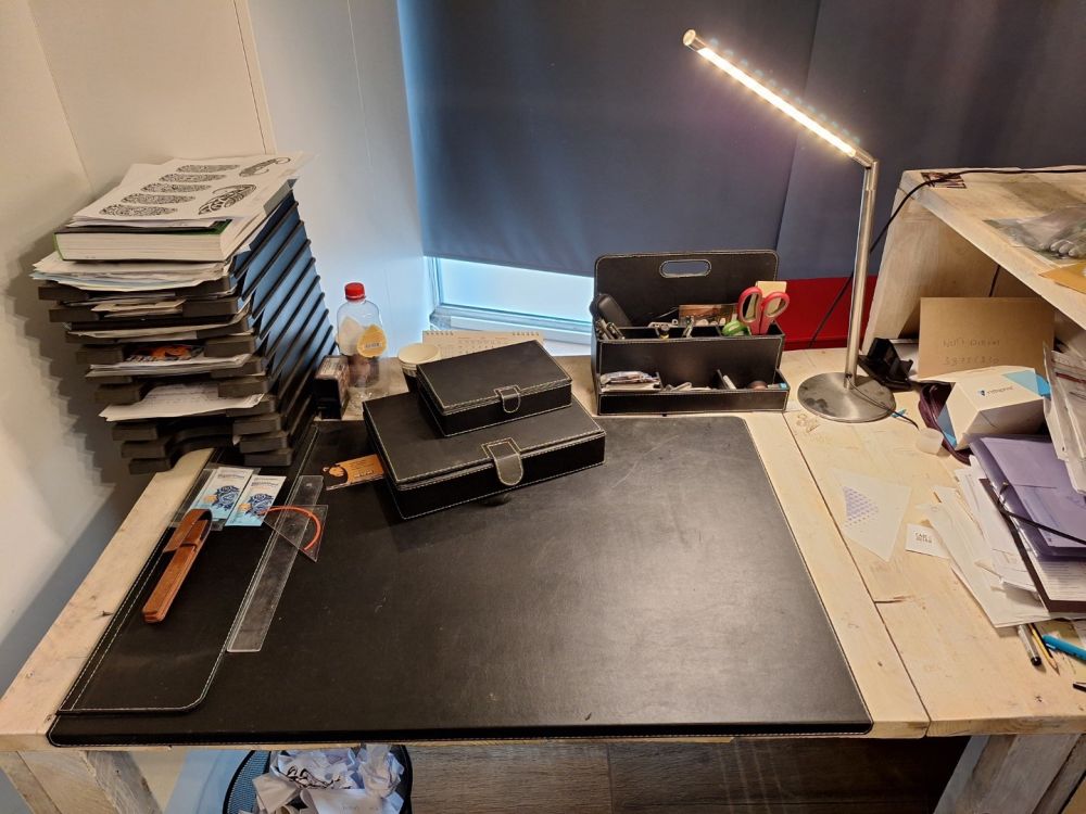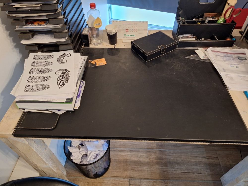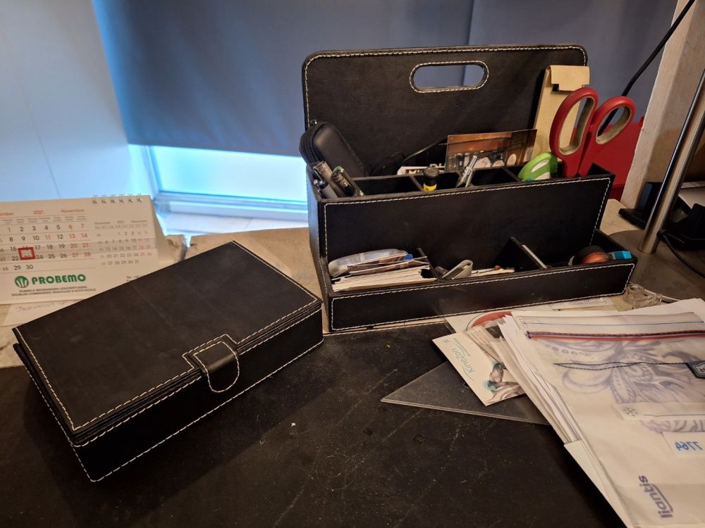 Bureau accessoires (pennen,perforator,lederlook onderlegger en opbergtassen met schaar,stiften en potloden)