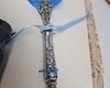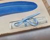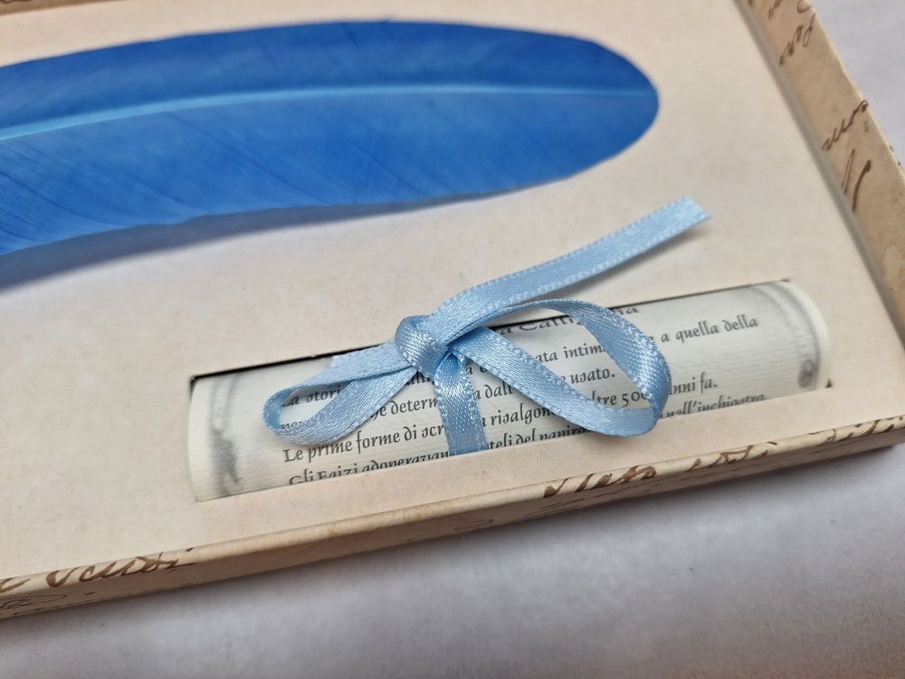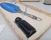 Elegante veerpen-set: blauwe struisvogelveer quill met rijk bewerkt zilveren penhouder en nib, compleet met zwart inktflesje, in nostalgische presentatie.
