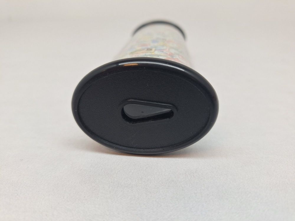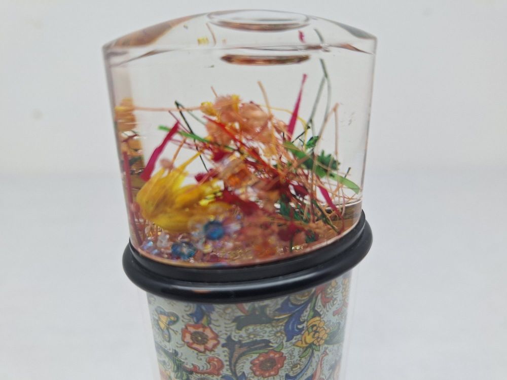 Luxe olie-kaleidoscoop met klassiek William Morris "Strawberry Thief"-patroon (vogels en bloemen in rood, blauw, groen en geel), gevuld met kleurrijke zwevende elementen in vloeistof voor steeds veranderende patronen.