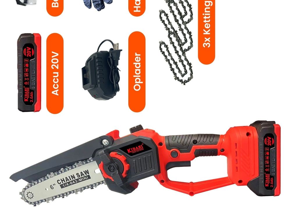 Kibani Accu Takkenzaag - Elektrische Zaag - Draadloos - Inclusief Accesoires - Mini Kettingzaag - 15 cm - Met Opbergkoffer, Omvang (B x H): 12cm x 24cm Display: Ja Meegeleverde accu: Ja Zaag snelheid: 8 M/s Verstelbaar: Ja