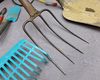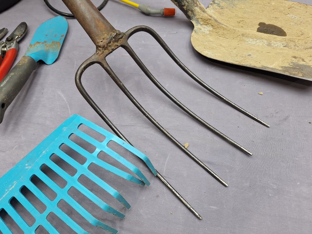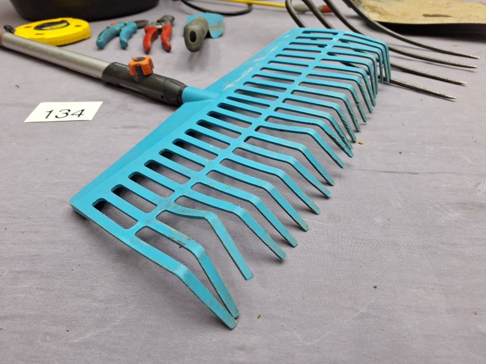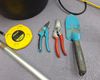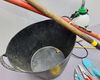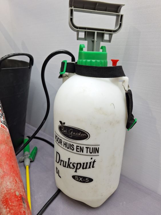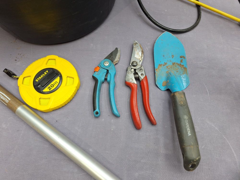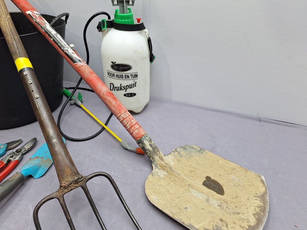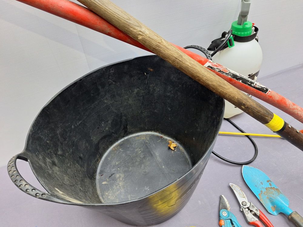 Zwarte tuinemmer met daarin :schup,riek,2 snoeischaren,lintmeter,hark,drukspuit en plantschupje