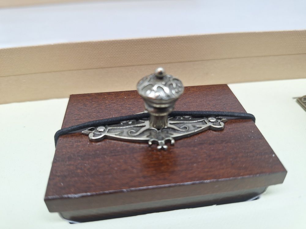 | Inhoud | Veerpen (blauw), Geëtste penhouder, 2 metalen inktpotten/houders (klassiek design), Pennenhouder (leren/hout), Inktpotje, 1 losse penpunt |