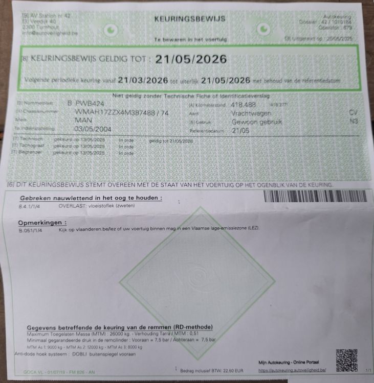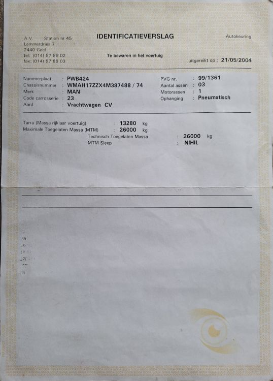 | Documentatie | Alle originele keuringsbewijzen en identificatieverslagen zijn aanwezig |
