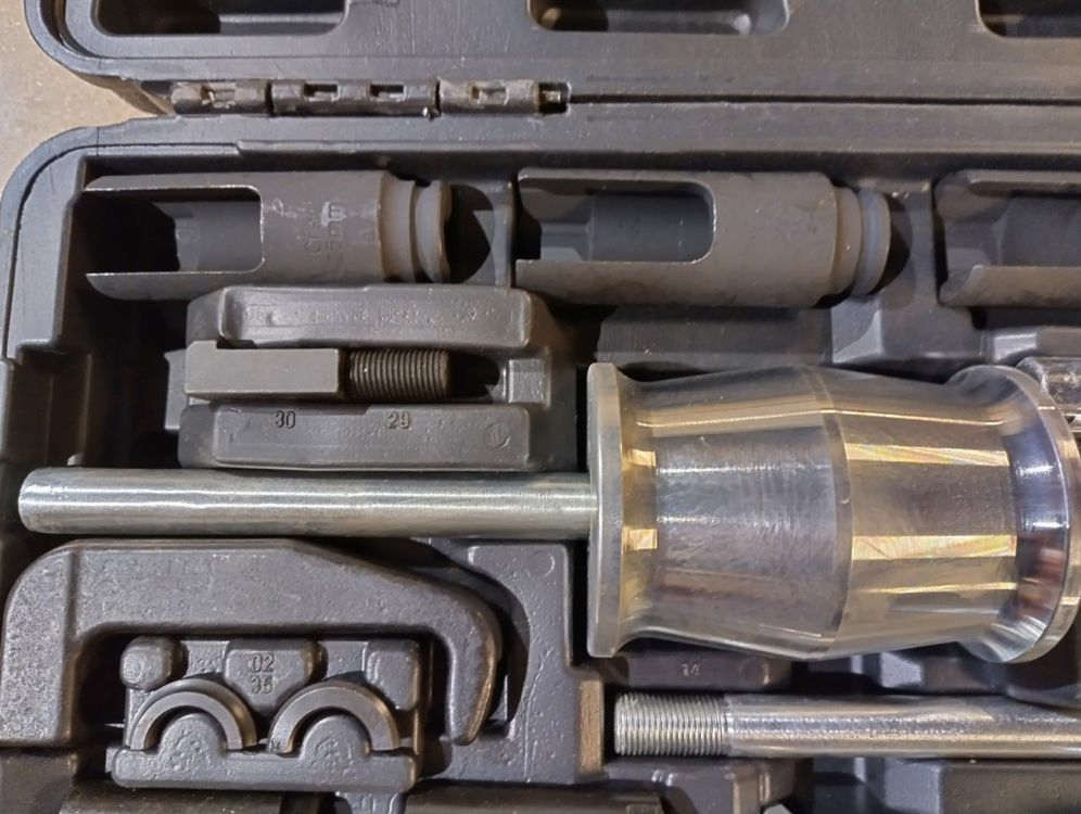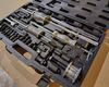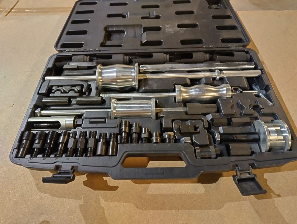 3x slangtrekker: 1.6kg/160mm, 2.7kg/460mm, 5.1/600mm, Trekvorken met openingen: 13.7x18mm, 105mm lang, 12.7x19mm, 130mm lang. Slotted 1/2" Drive sockets, 6 pt, 100mm long. 25/27/28/29/30mm, -Sleeve design injector extractor with supporting shells, outer diameter 35mm internal diameter 29mm, M17x1.0 spindle, -Pulling adapter with external thread M27x1.0(3pcs) and M25x1.0 -Pulling adapter with internal thread M27x1.0(3pcs), Sliding hammer adapter for inner, outer and claw extractor