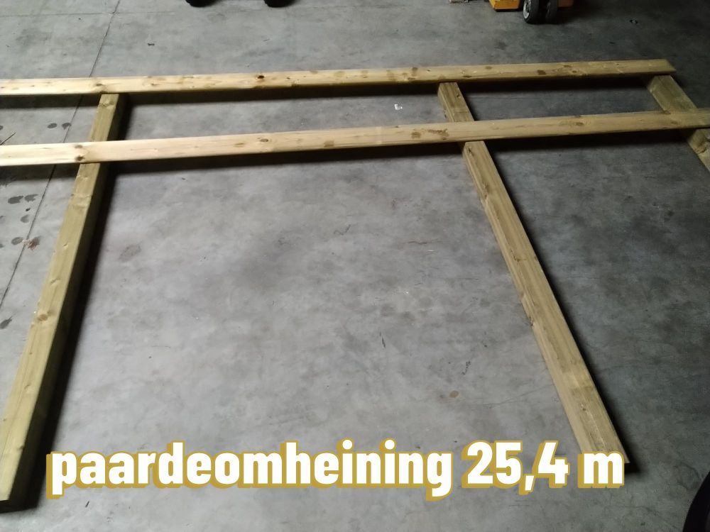 1x Paarden weide omheining, 25,2 meter, onder druk geïmpregneerd grenen, 15 palen van 270cm., 14 planken van 360cm., 120 schroeven. Let op! Dit is een bouwpakket