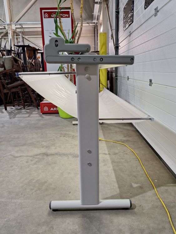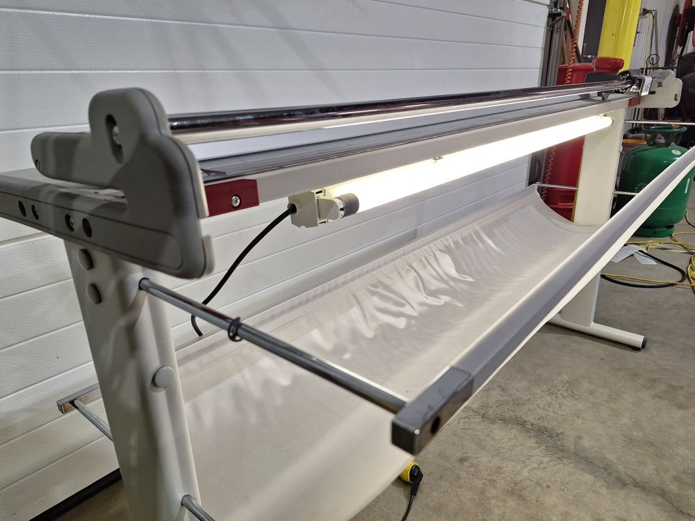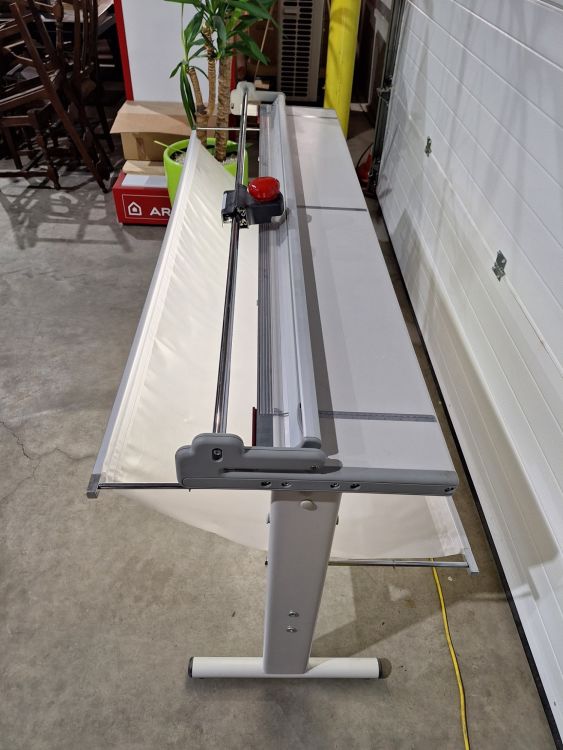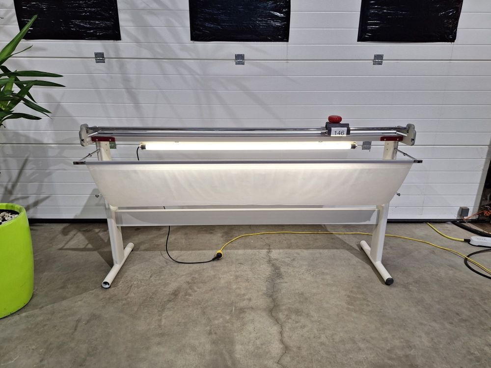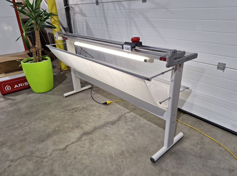 + Grootformaat rolsnijder met horizontale snijrail en roterende mesunit. + Model: TRIM 150 C/B III – geschikt voor papier, posters en andere vlakke materialen tot ca. 150 cm breed. + Voorzien van geïntegreerde TL-verlichting onder de snijbalk voor optimale zichtbaarheid tijdens het snijden. + Stevig wit metalen onderstel, stabiel en industrieel inzetbaar. + Ideaal voor drukkerijen, ontwerpstudio’s, scholen of technische afdelingen.