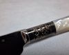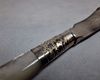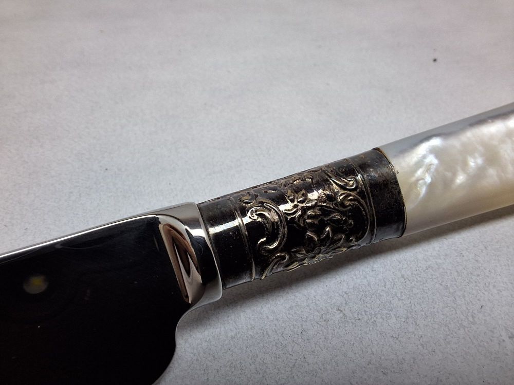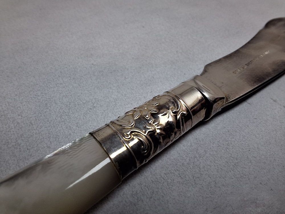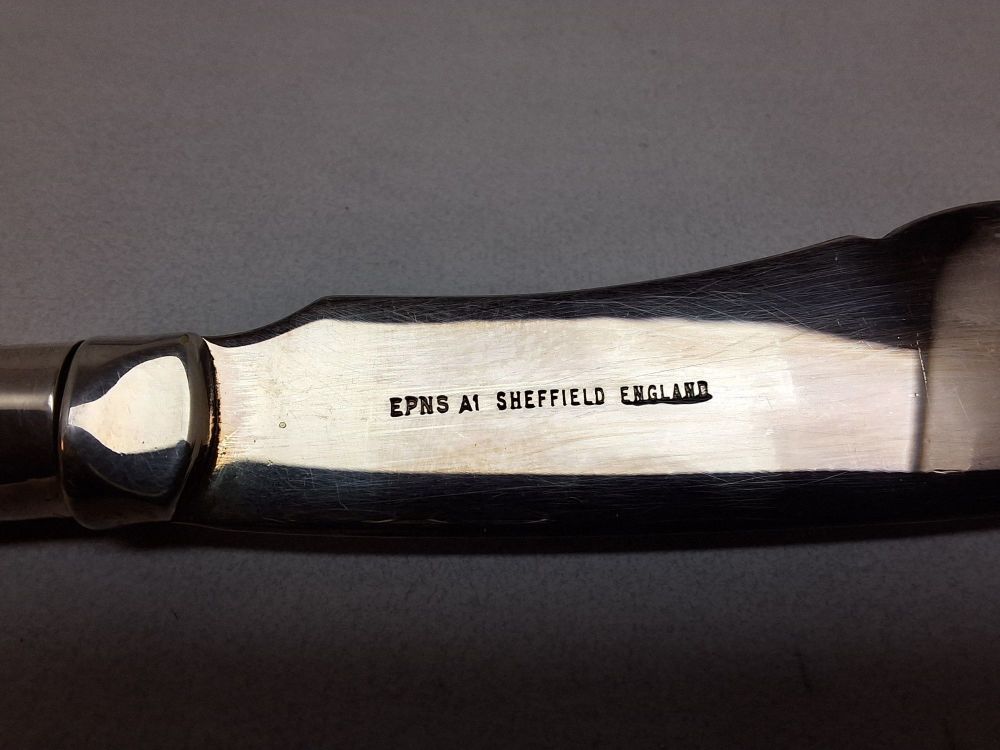 Kenmerken: De lemmeten zijn van roestvrij staal en gemerkt met "Sheffield Made England". De overgang tussen het handvat en het lemmet is versierd met een sierlijk, gegraveerd zilverkleurig bandje.