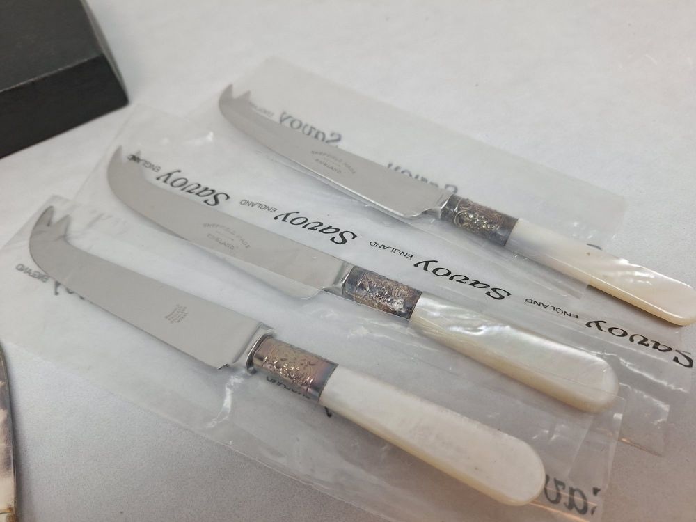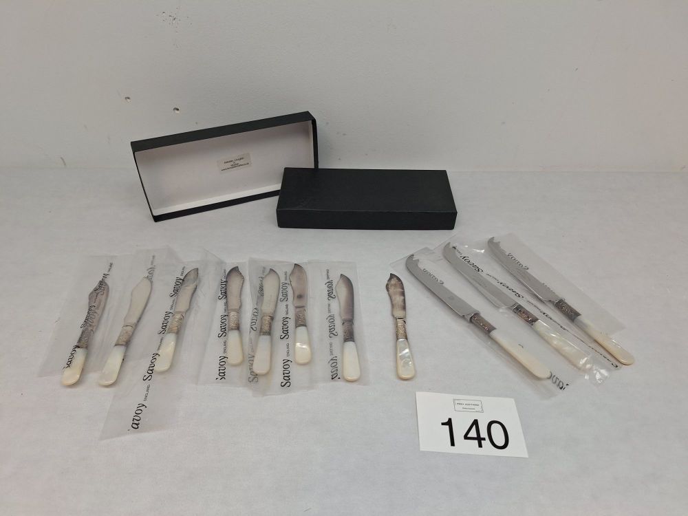 | Name: | Set van 11 Vintage Savoy Sheffield Botermessen en Kaasmessen met Parelmoer Handvatten. |