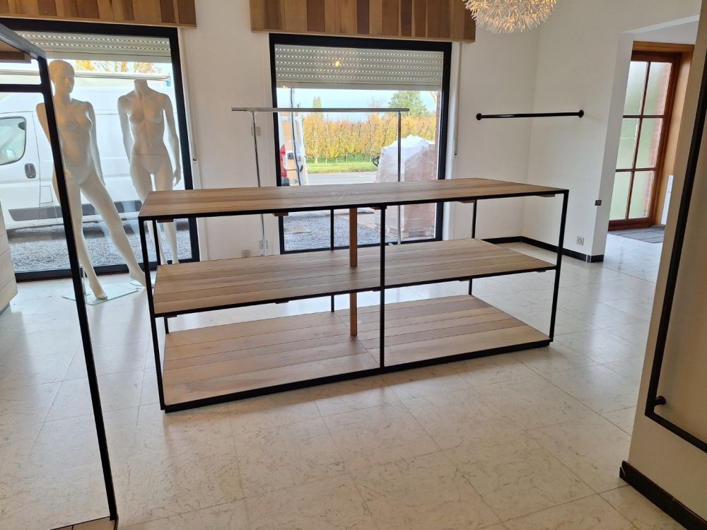 | Name: | Strakke industriële tafel met 3 niveau's met zwart metalen onderstel |