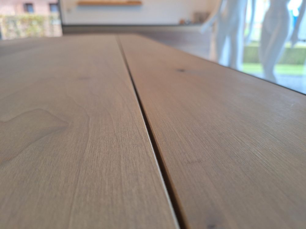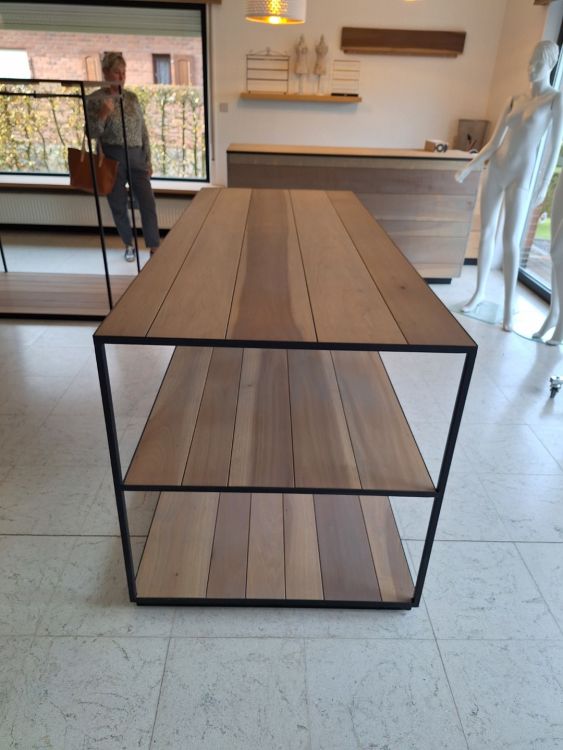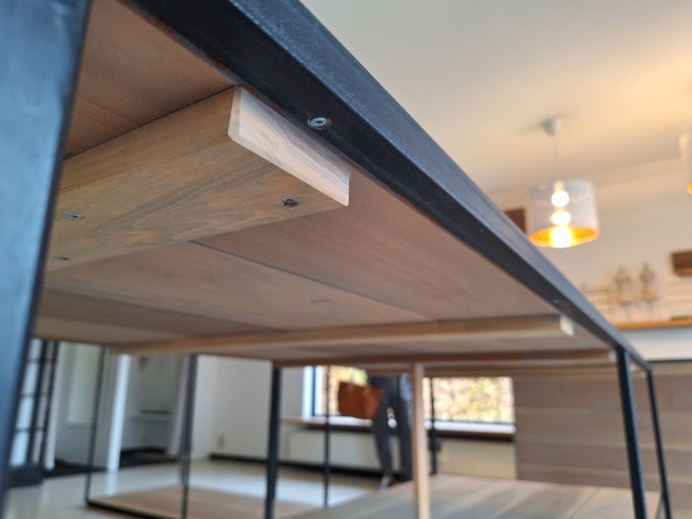 1 x tafel met 3 massief houten leggers zwart metalen onderstel L220xB90xH94cm