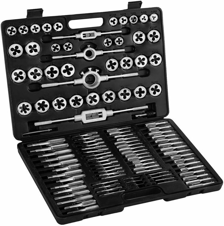 35 snijplaten in de volgende maten, M2 x 0,4 - M3 x 0,5 - M4 x 0,7 - M5 x 0,8 - M6 x 1,0 - M6 x 0,75 - M7 x 1,0 - M7 x 0,75 - M8 x 0,75 - M8 x 1,0 - M8 x 1,25 - M9 x 0,75 - M9 x 1,0 - M9 x 1,25 - M10 x 0,75 - M10 x 1,0 - M10 x 1,25 - M10 x 1,5 - M11 x 0,75 - M11 x 1,0 - M11 x 1,25 - M11 x 1,5 - M12 x 0,75 - M12 x 1,0 - M12 x 1,25 - M12 x 1,5 - M12 x 1,75 - M14 x 1,0 - M14 x 1,25 - M14 x 1,0 - M14 x 2,0 - M16 x 1,0 - M16 x 1,5 - M16 x 2,0 - M18 x 1,5. Met 2 Snijplaat houder, verstelbaar - 1 T-sleutel taphouder - 2 taphouders - 1 adapter. Gebruik Voor fijne schroefdraad voering.