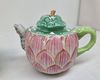 Lotus / Artisjok theepot – roze bloemvorm, groene bladdeksel, vogelvormige tuit