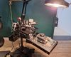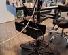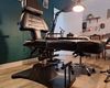 Verstelbare zwarte tattoo-stoel met rug-, zit- en beensteunen,zwarte rolkruk en armsteun en verstelbare lamp