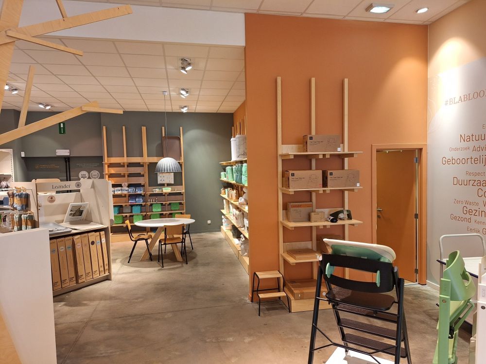 Constructie: Modulair wandsysteem met verticale houten staanders en horizontale achterlatten waaraan de schappen blind gemonteerd worden.