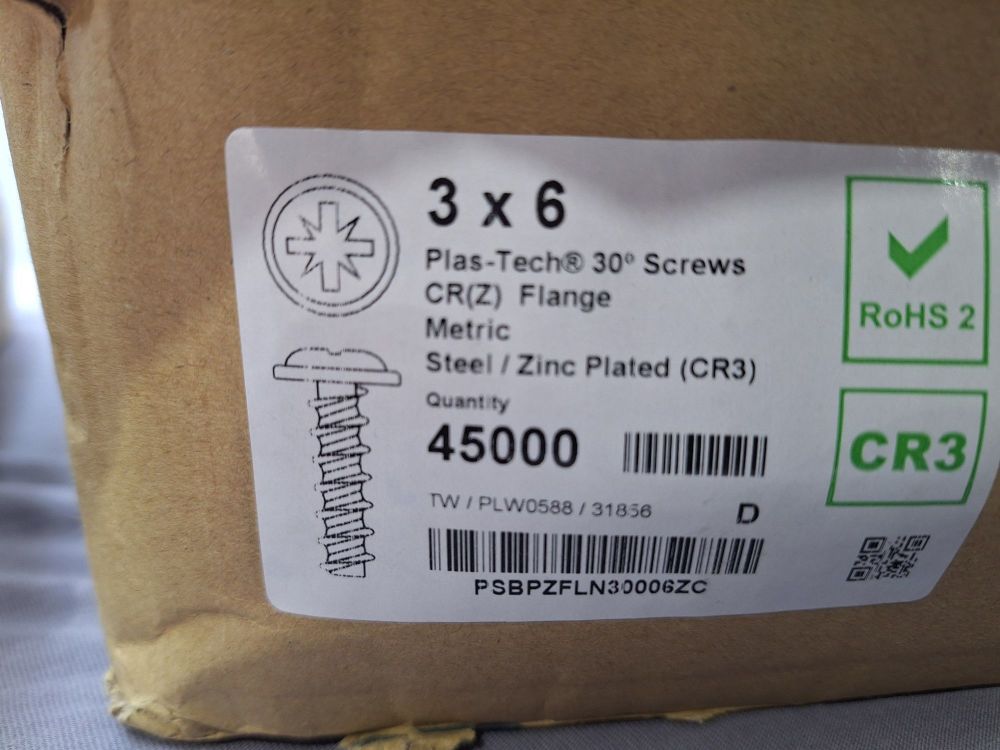Bulkverpakking van flenskopschroeven voor kunststof, type Plas-Tech® 30°, staal verzinkt (CR3). Afmeting: 3 x 6 mm – Aantal: ±80.000 stuks