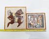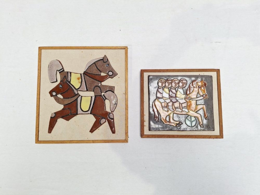 | Nom: | 2 reliëftegels in houten lijst – paard & figuren, wanddecoratie |