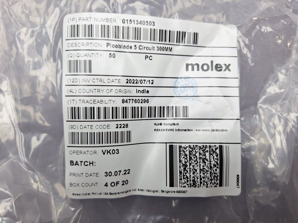 Professionele kabelassemblages van het merk Molex, type Picoblade 5 Circuit – 300 mm. Elke kabel heeft 2 witte 5-polige connectoren en is geschikt voor data- of stroomverbindingen in elektronische toepassingen. Verpakt in 20 zakjes, elk met 50 stuks – Totaal: 1000 kabels Herkomst: India – RoHS-conform – met traceerbare batchinformatie