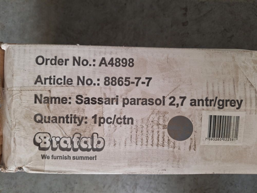 | Nom: | Brafab Sassari Parasol – Ø 2,7m – Antraciet/Grijs – Nieuw in doos |