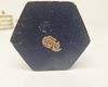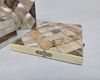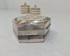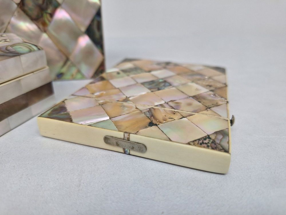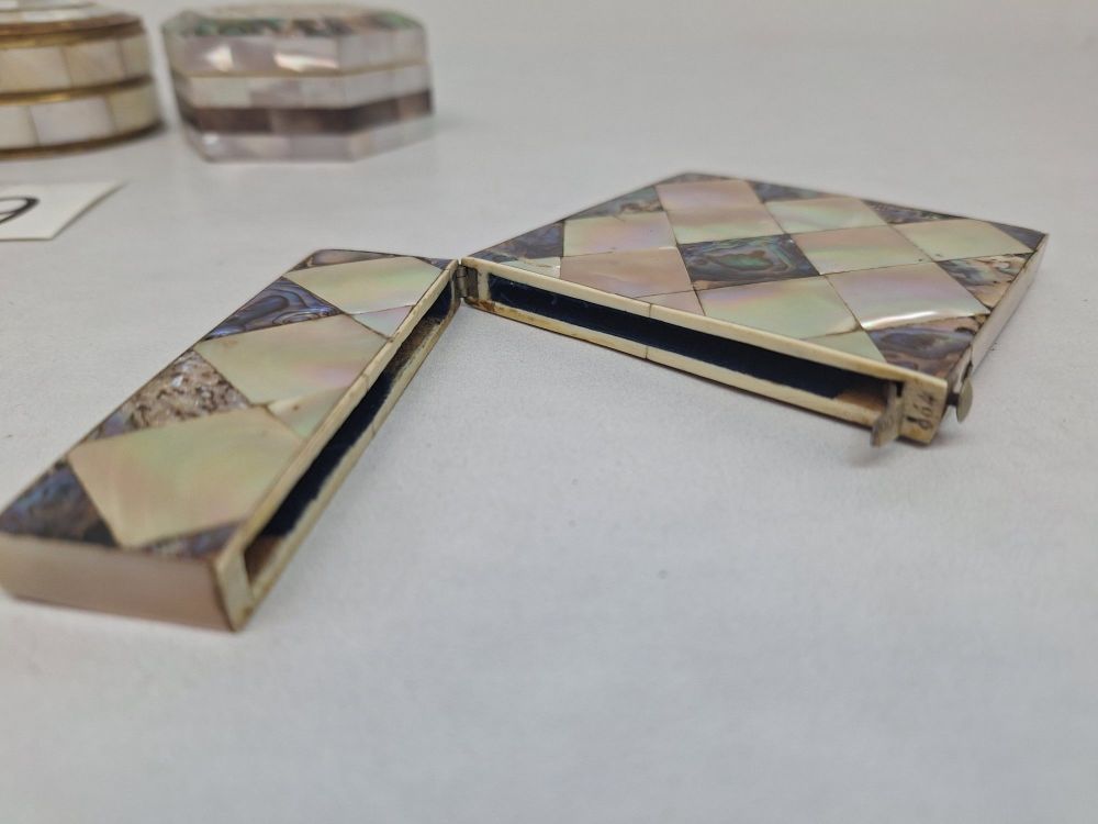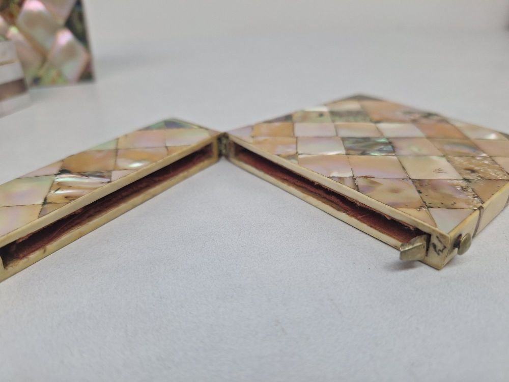 Eén rechthoekig plat doosje met ruitvormig parelmoerpatroon en messing sluiting.