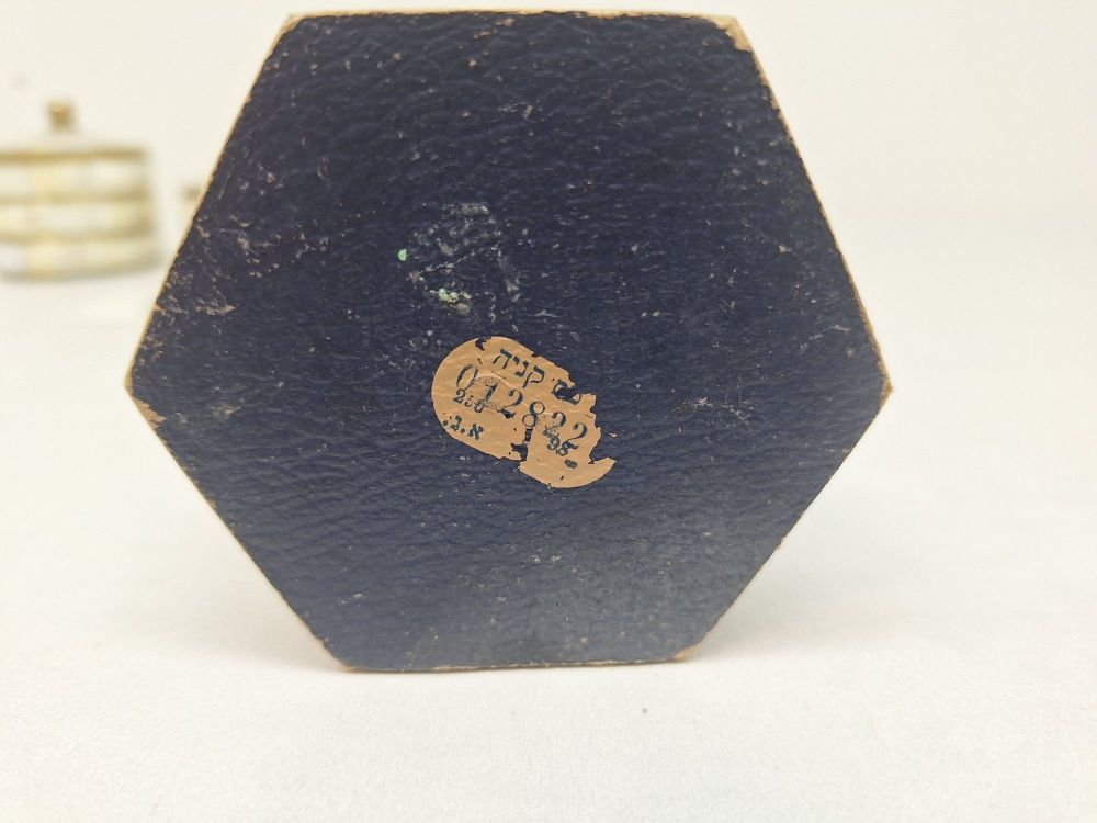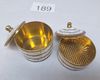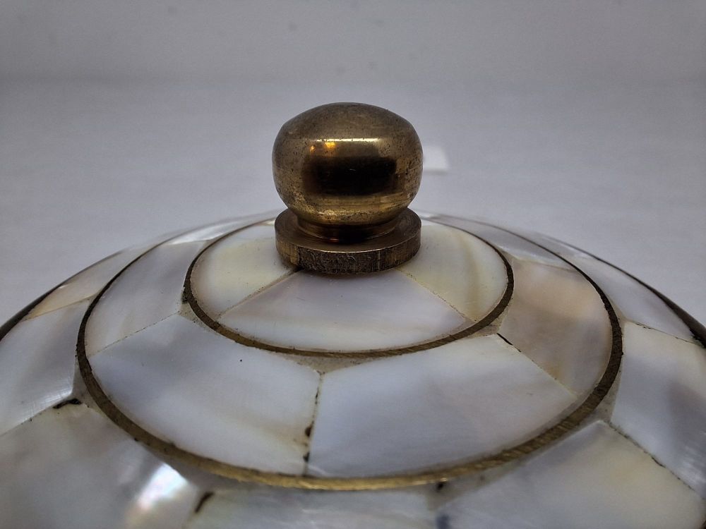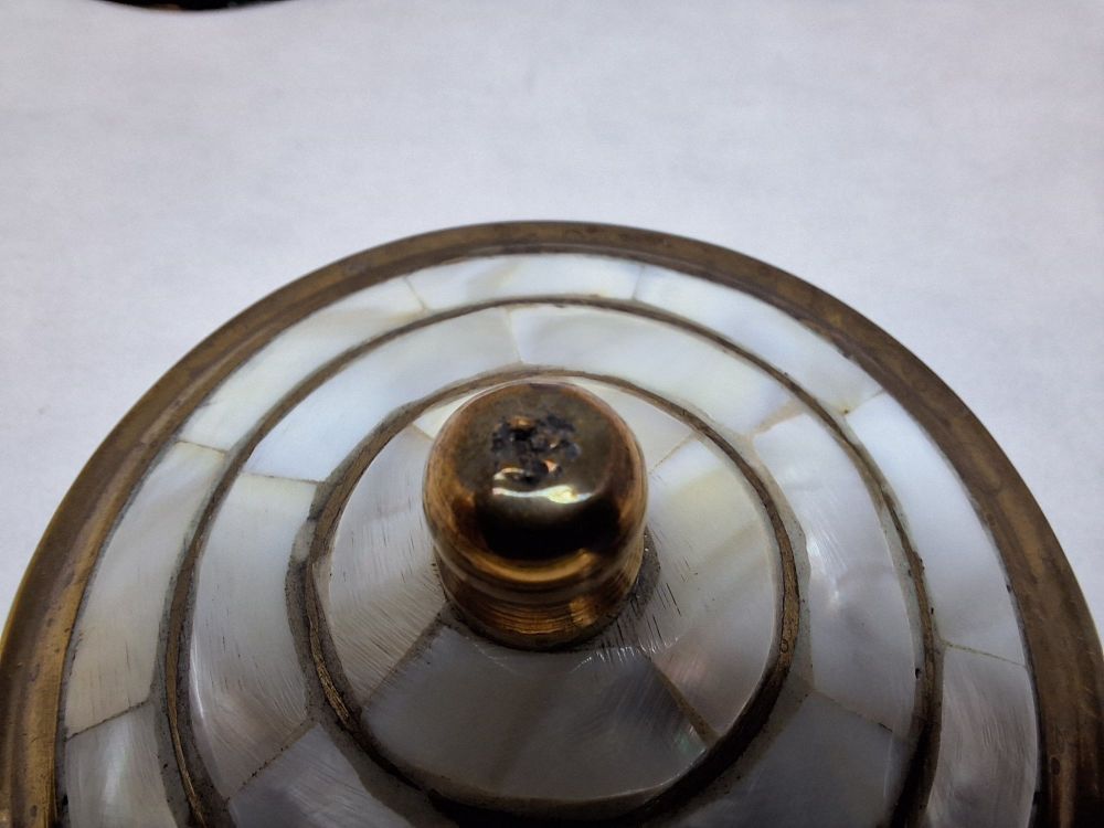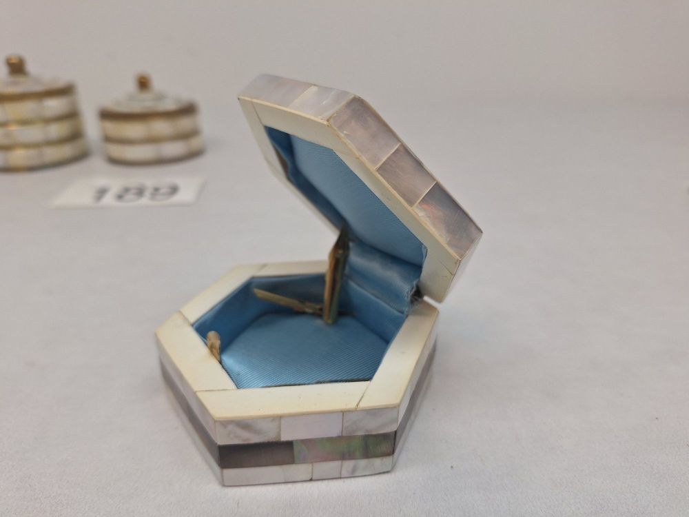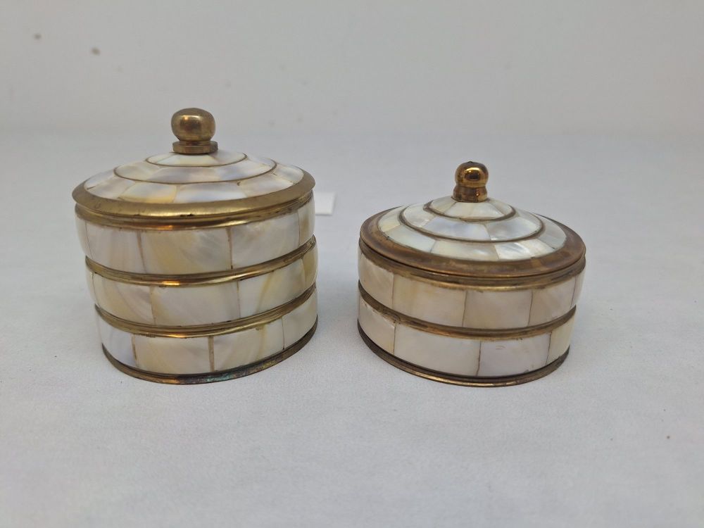 Twee cilindrische potjes met scharnierend deksel en messing knop, ingelegd met parelmoer segmenten en messing banden, verguld interieur.