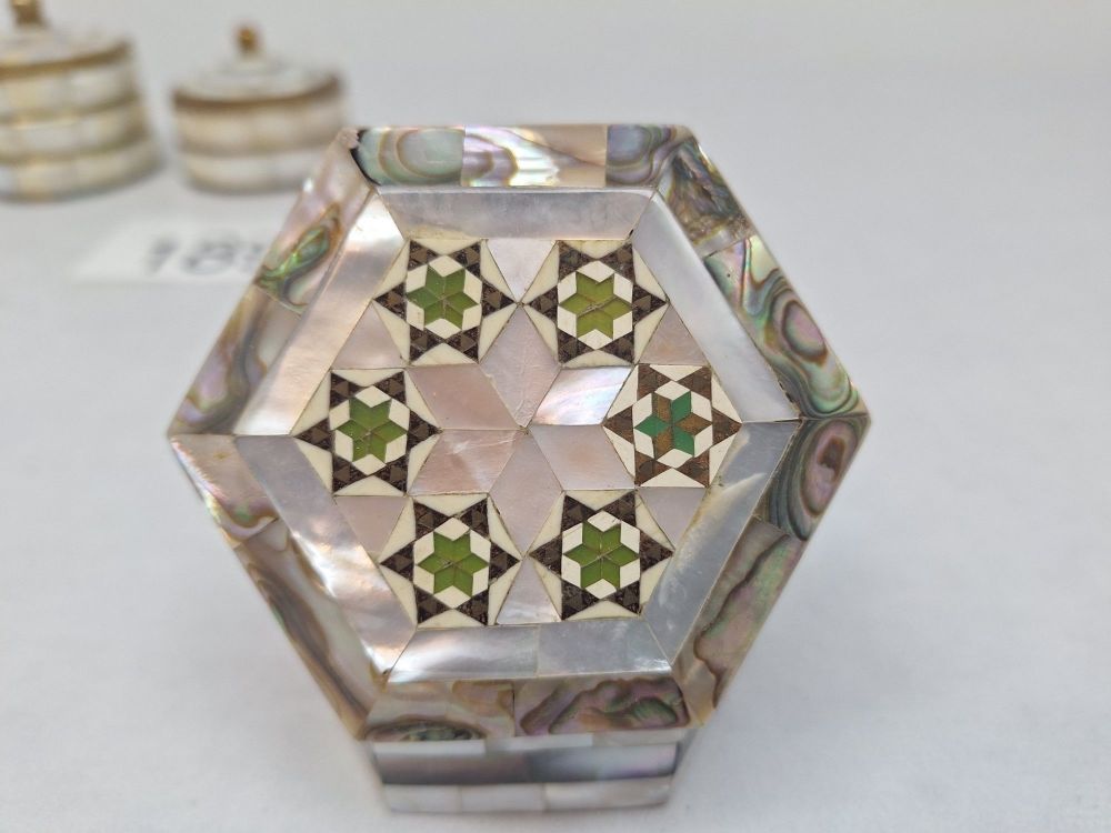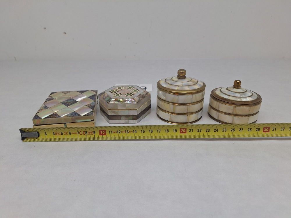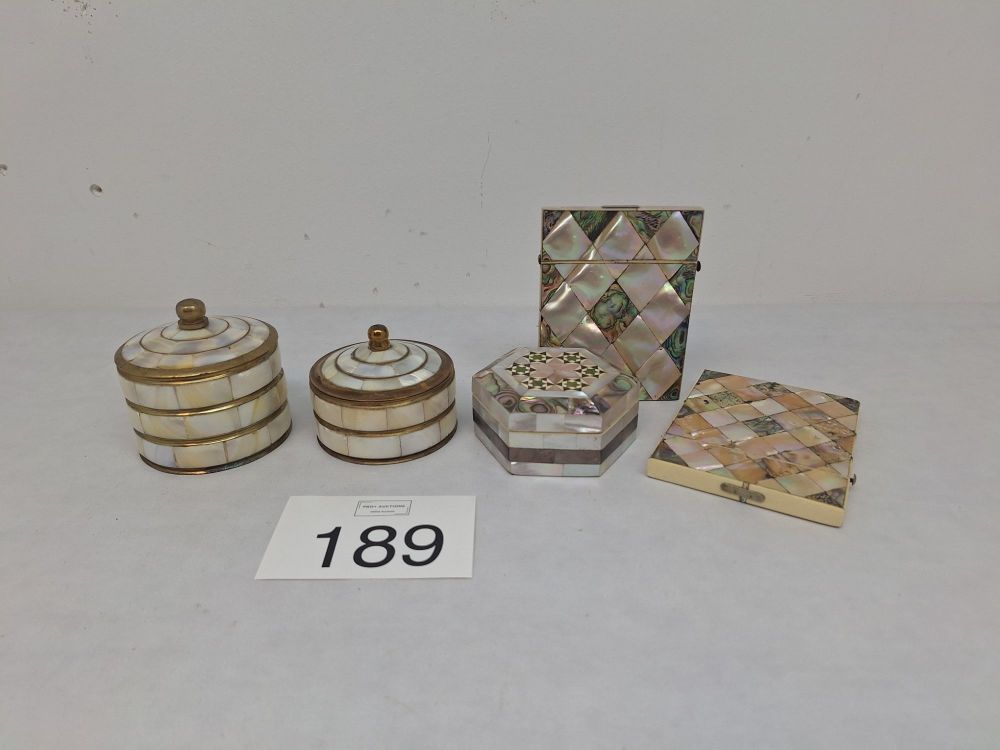 | Nom: | Collectie van vijf decoratieve doosjes en etuis met parelmoer- en abalone-inleg |