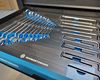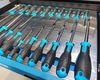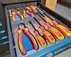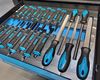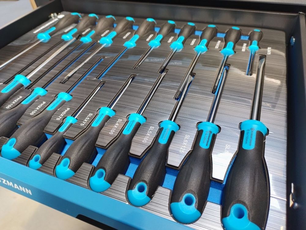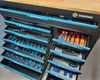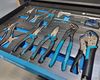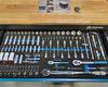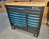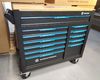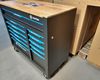 Unieke grote gereedschapswagen met 12 laden waarvan 10 laden gevuld met kwaliteits gereedschap, degelijke wagen met lades en wielen lopend op kogellagers, Houten bovenblad voor gebruik als werkbank, 1 meter breed,gewicht ca 120 kg, nieuw in doos