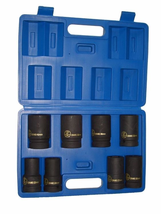 Doppenset, kracht 1″, 8-dlg. CR-M0, 22-41x 88 mm, Phosphated zwartOmschrijving: Doppenset, kracht 1″, 8 dlg. Maten 27-30-32-36-38-41-46-50 mm, voorzien van boring en kogel. Krachtdoppen geschikt voor zwaar werk met luchtcompressor. Materiaal: Chroom-Molybdeen, gefosforiseert. Krachtige ( Impact ) doppenset.