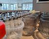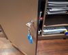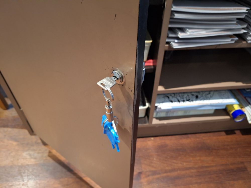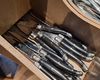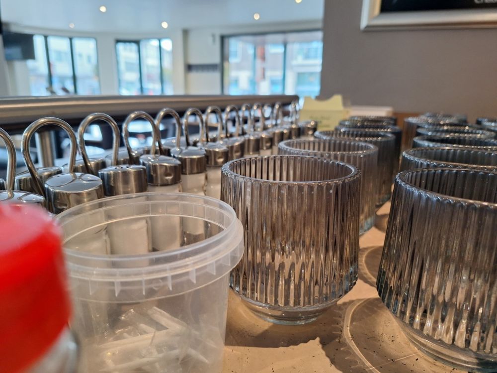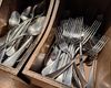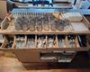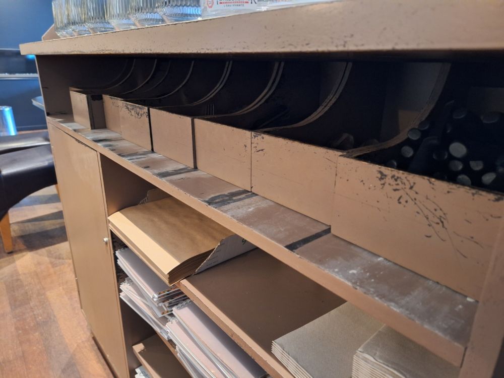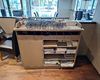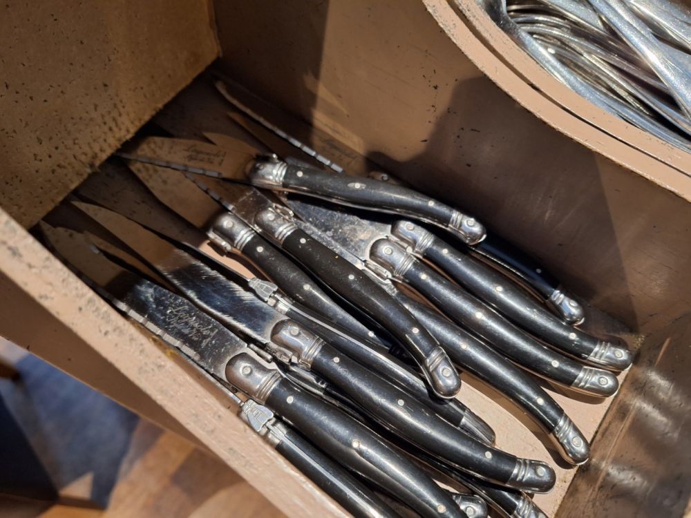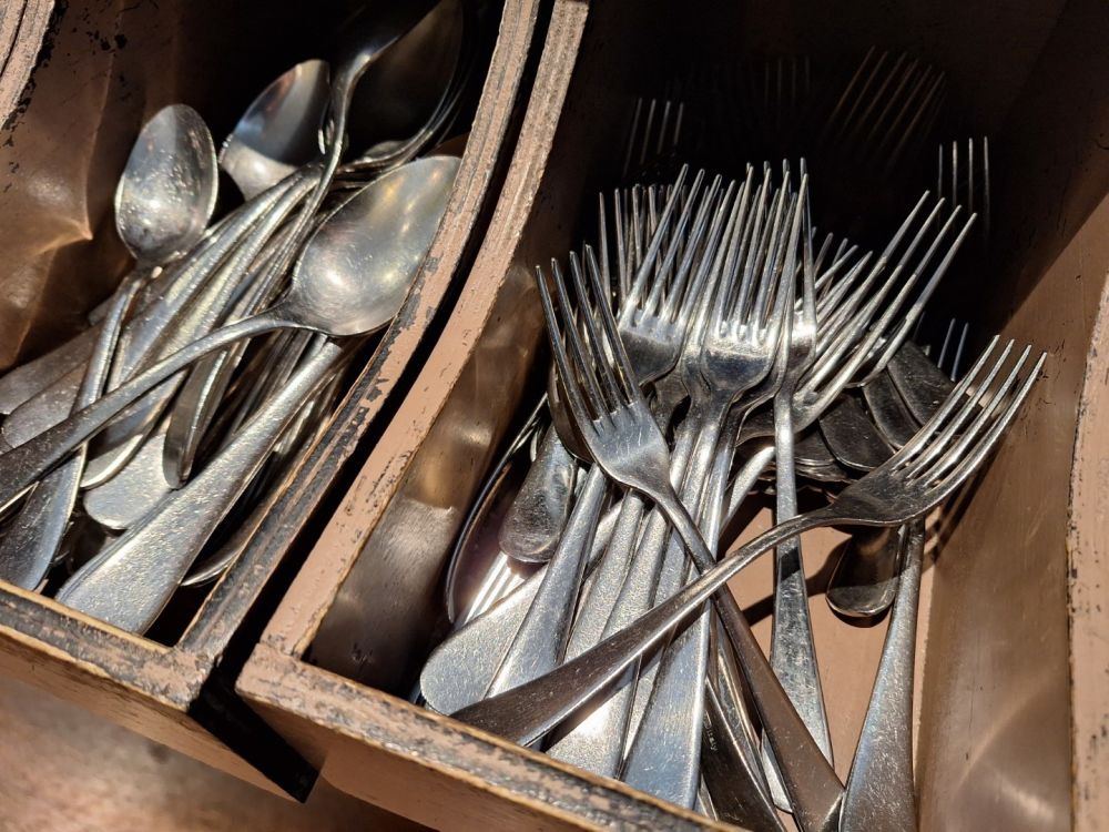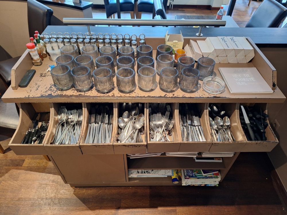 Houten desk afmeting 136x50x110cm open 1 deur met daarin 8 bestekbakjes gevuld met bestek(lepels,messen,vorken)15 peper en zout vaatjes,21 glazen kaarthouders