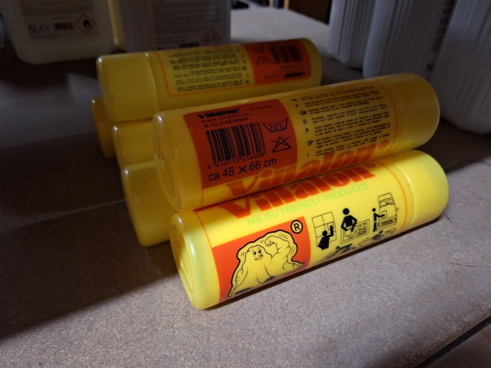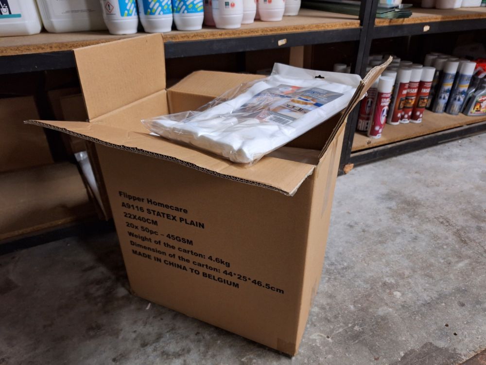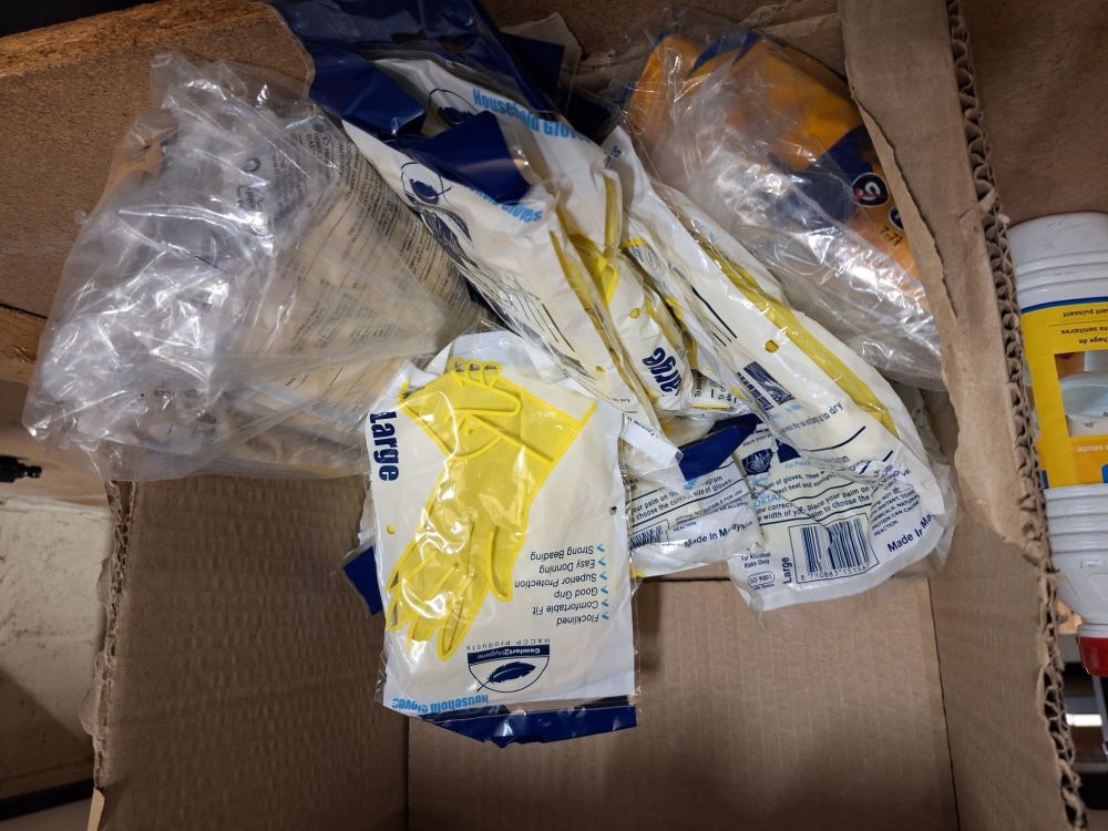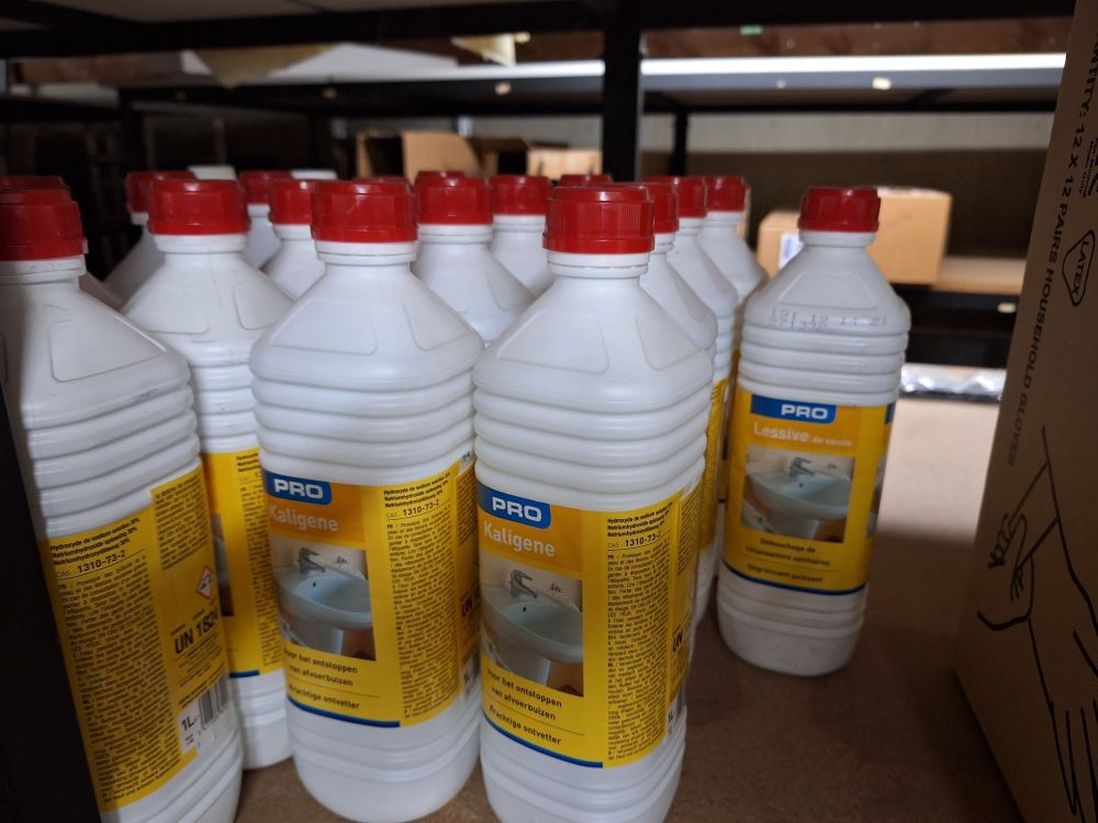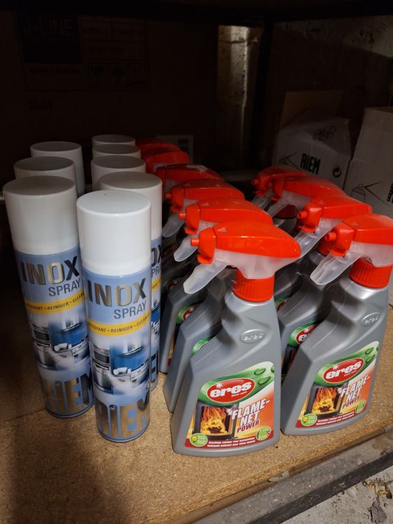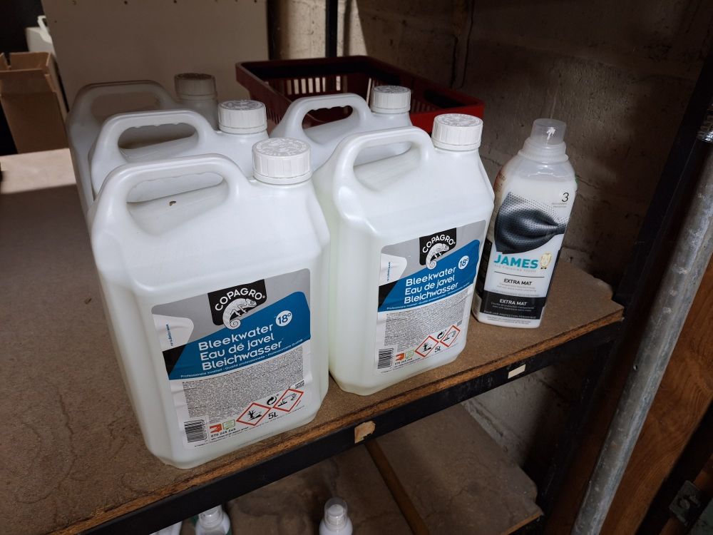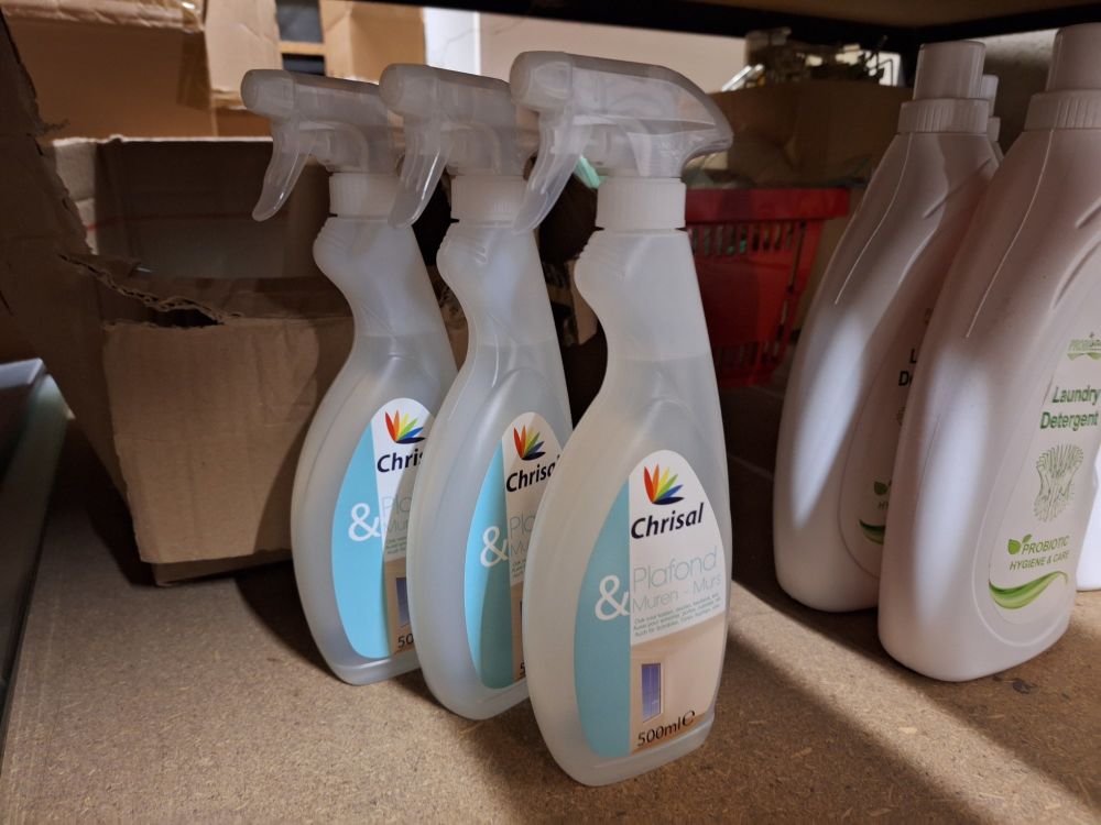 +/- 150st.voorraad diverse poetsproducten(sanitair,glas,brandbezine,bleekwater,ontvetter,stijfsel,stelen,handschoenen,doeken