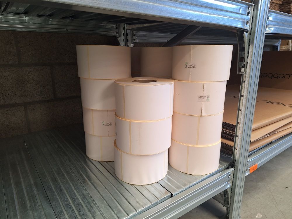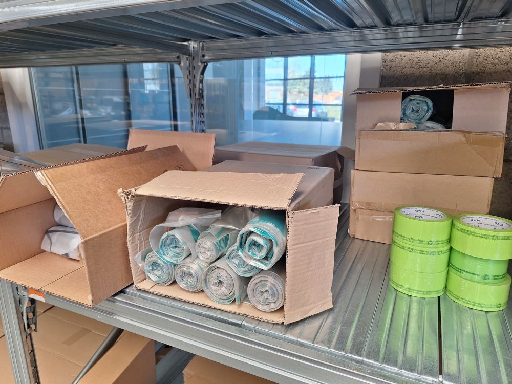 Kartonnen dozen,rollen vuilzakken,etiketten op rol