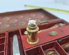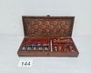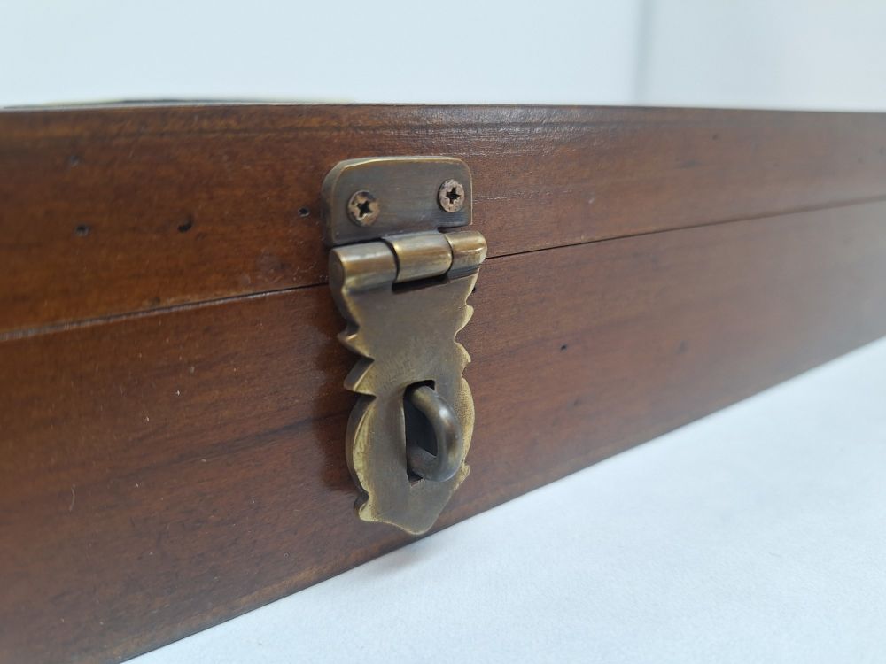 | Omslag/Kist | Houten kist met Messing beslag, bekleding binnenin met rood/zwart tapijt-achtig patroon |