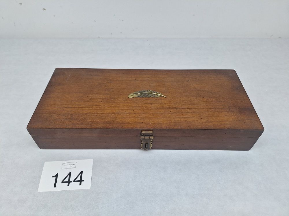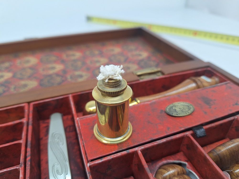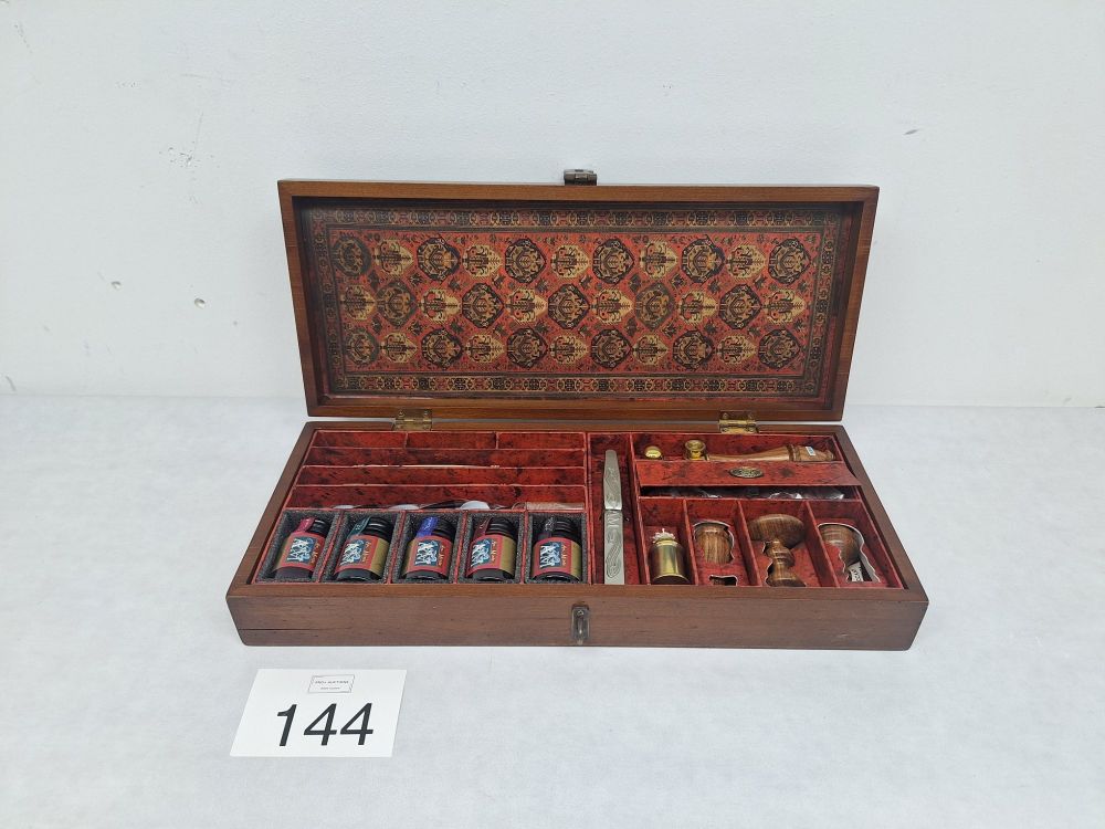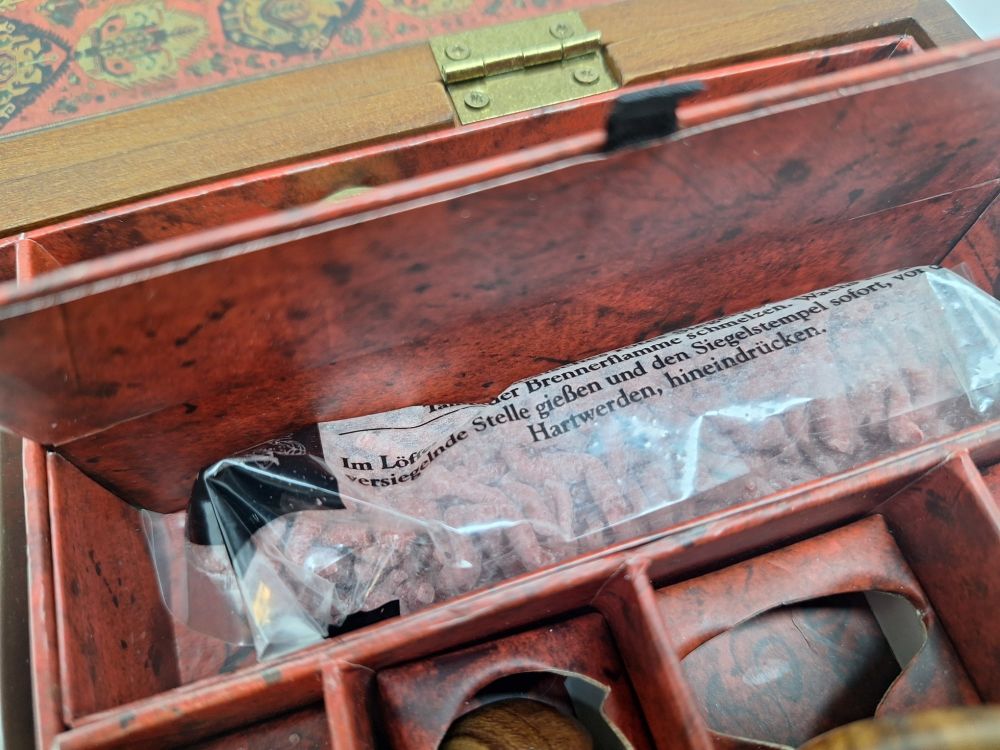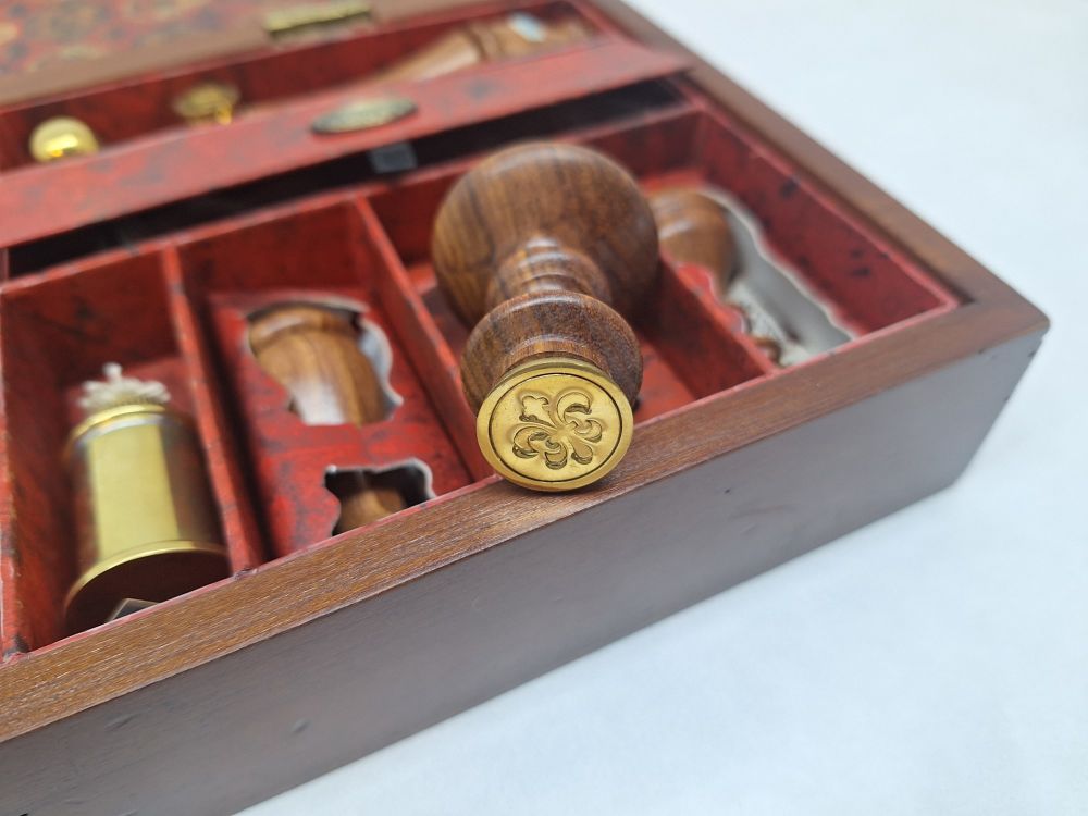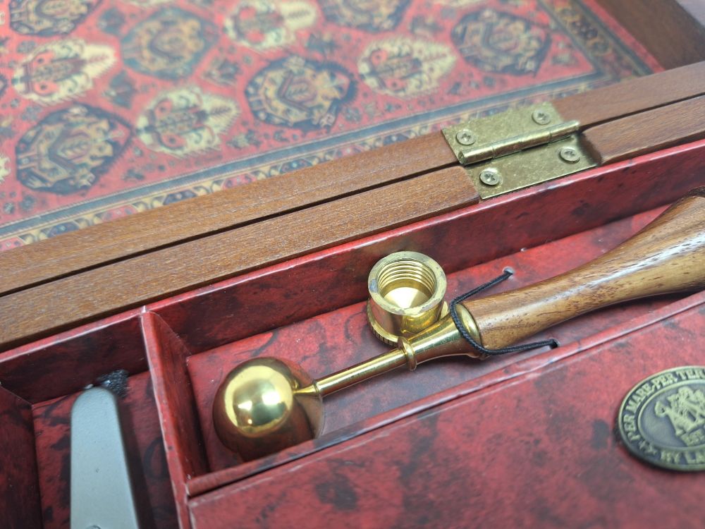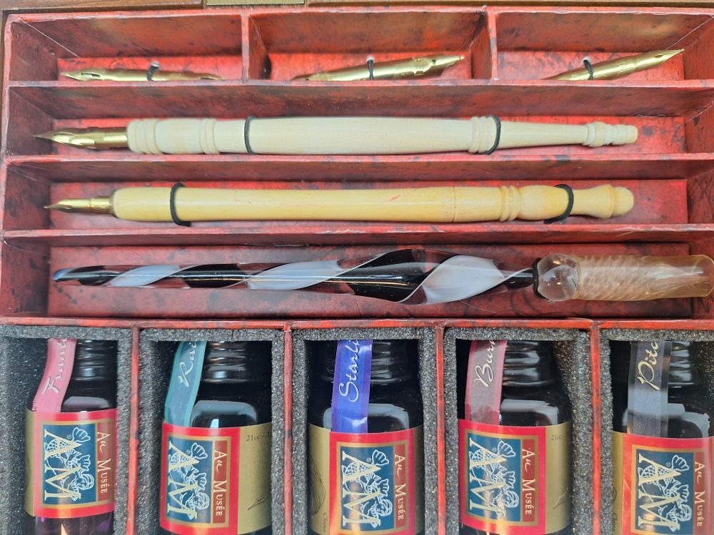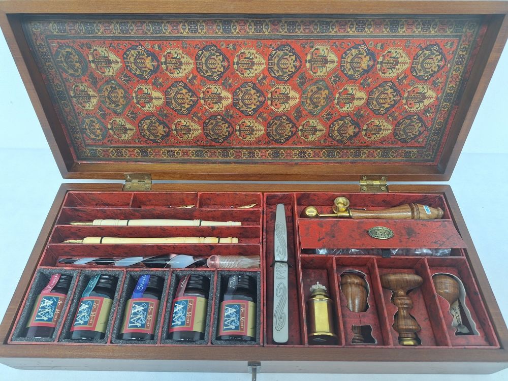 | Inhoud | 5 Inktflesjes (Arc Musée), 2 houten penhouders, 4 penpunten, 1 glazen pen (dippen), zegellak pellets, stempels, zegelpan en briefopener |