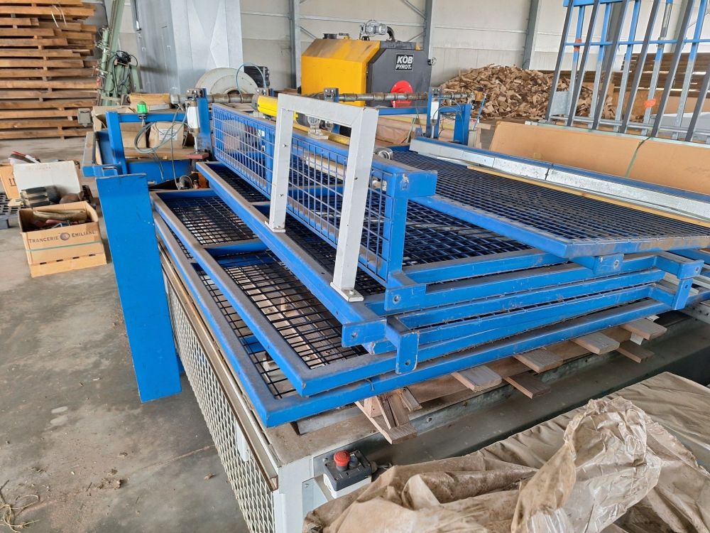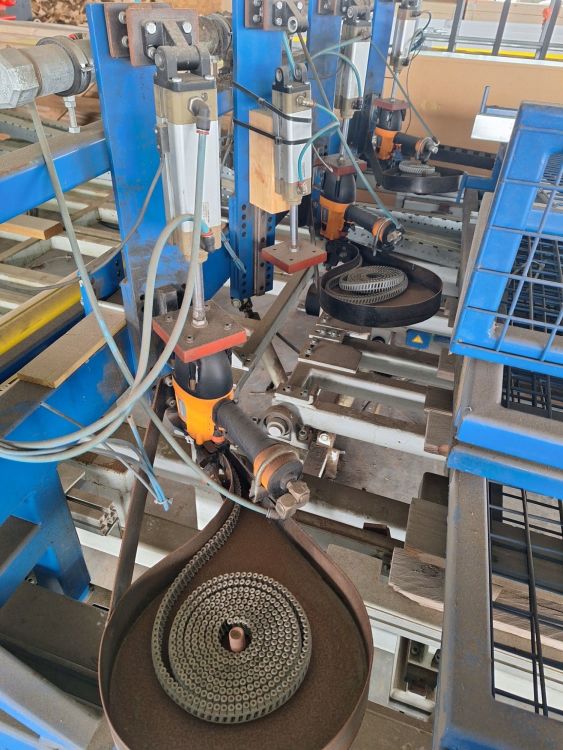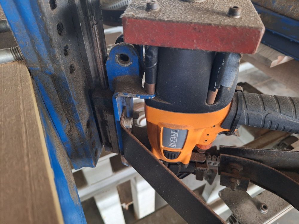 Unités de clouage : Plusieurs cloueurs pneumatiques (notamment de marque Rufast) montés sur un pont coulissant.