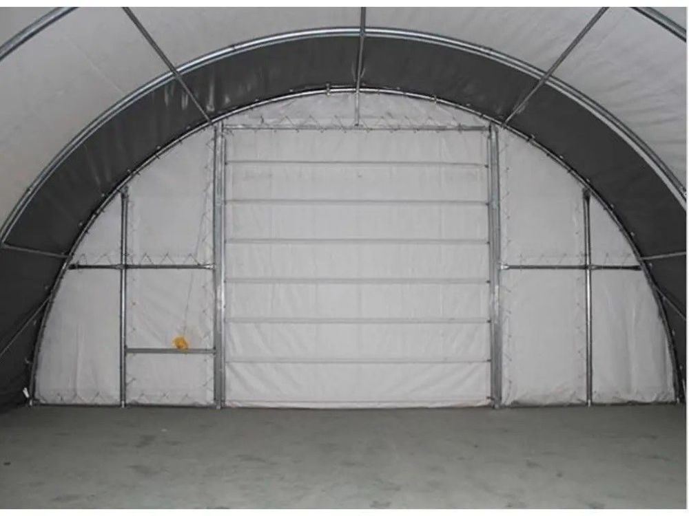 | Eversteel Opslag tent/Storage Building, afmeting: 26x10x4,5 mtr, 1380 kg, gegalvaniseerde buizen, met oprolbare deur (maat: 3,5x3,5 mtr) verpakt in ijzeren krat. |