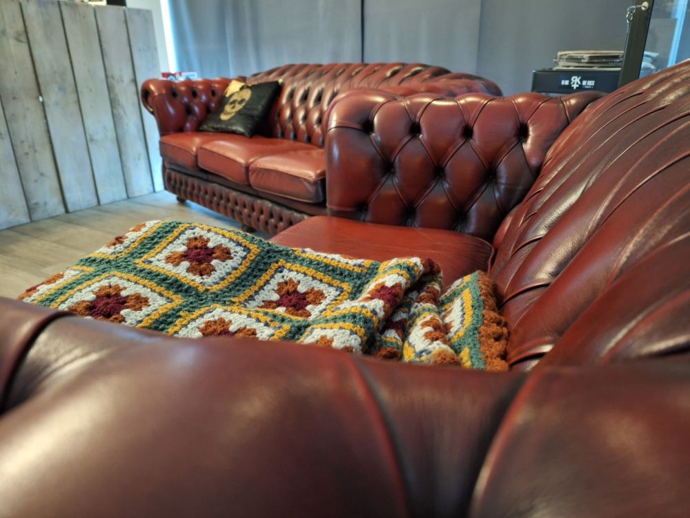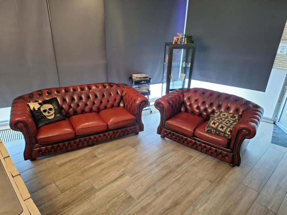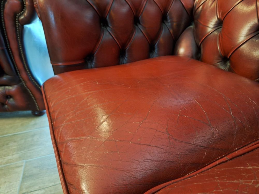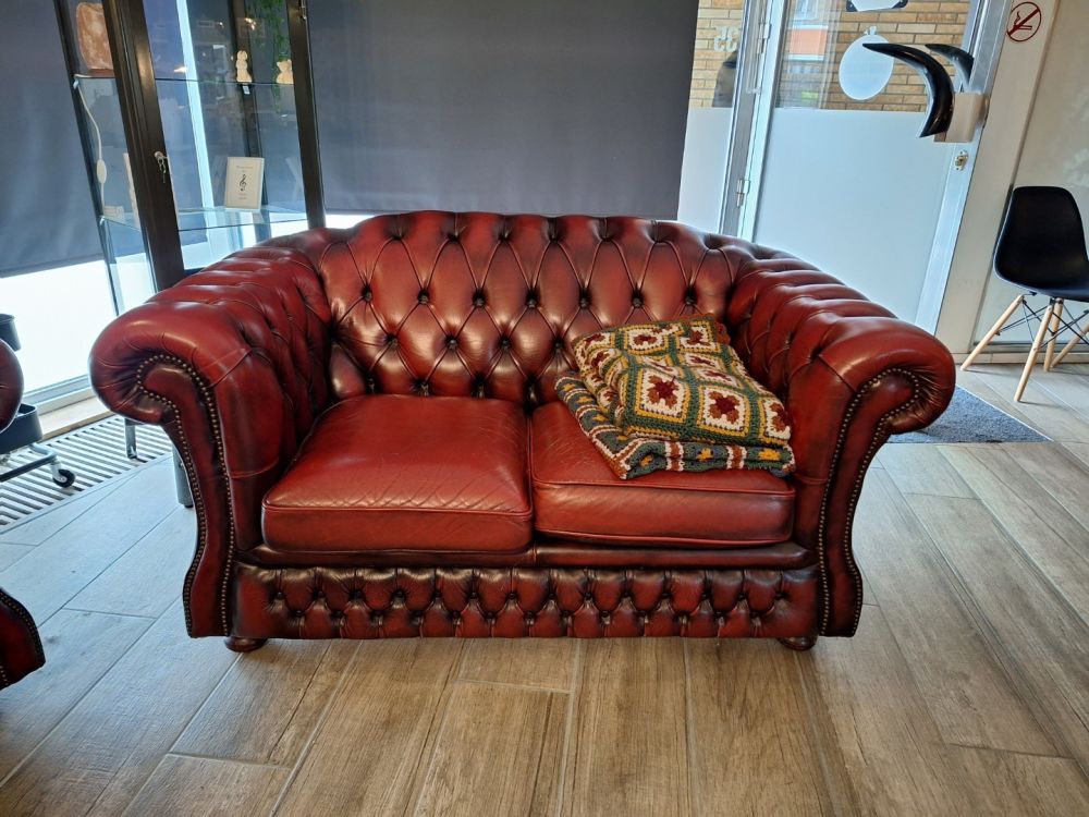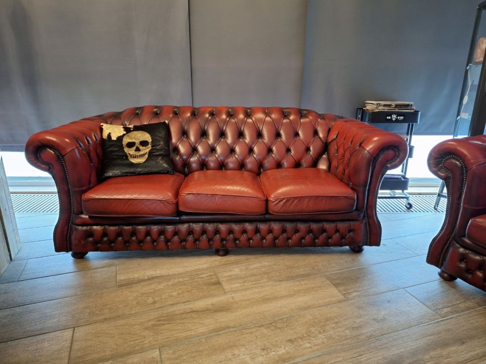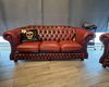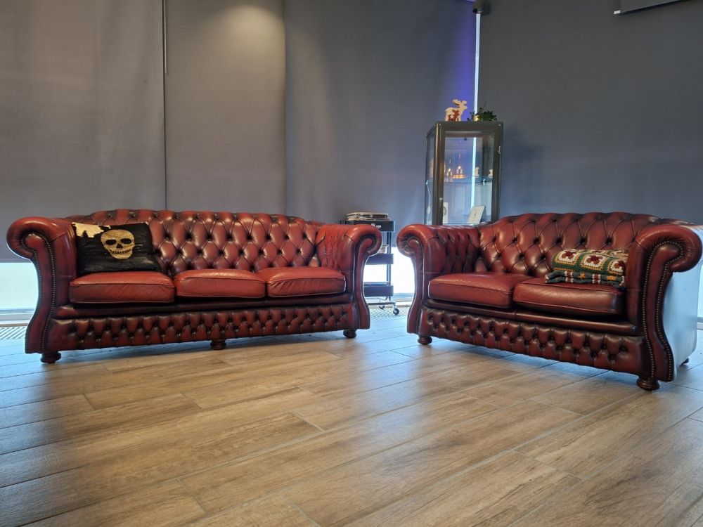 Klassieke Chesterfield 2+3 zits in rood leder bevind zich op gelijksvloer en is in zeer goede staat.