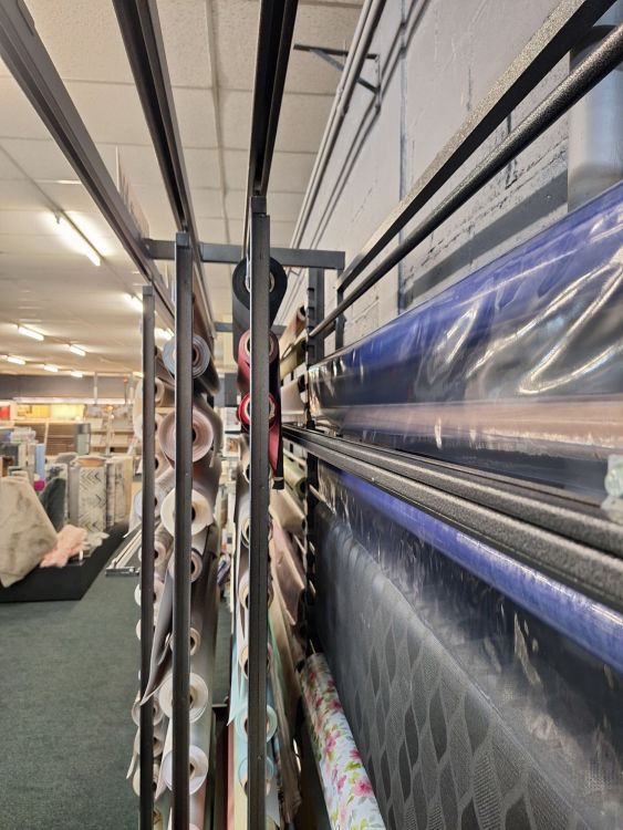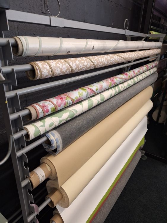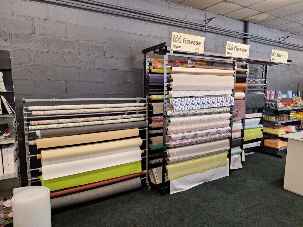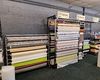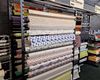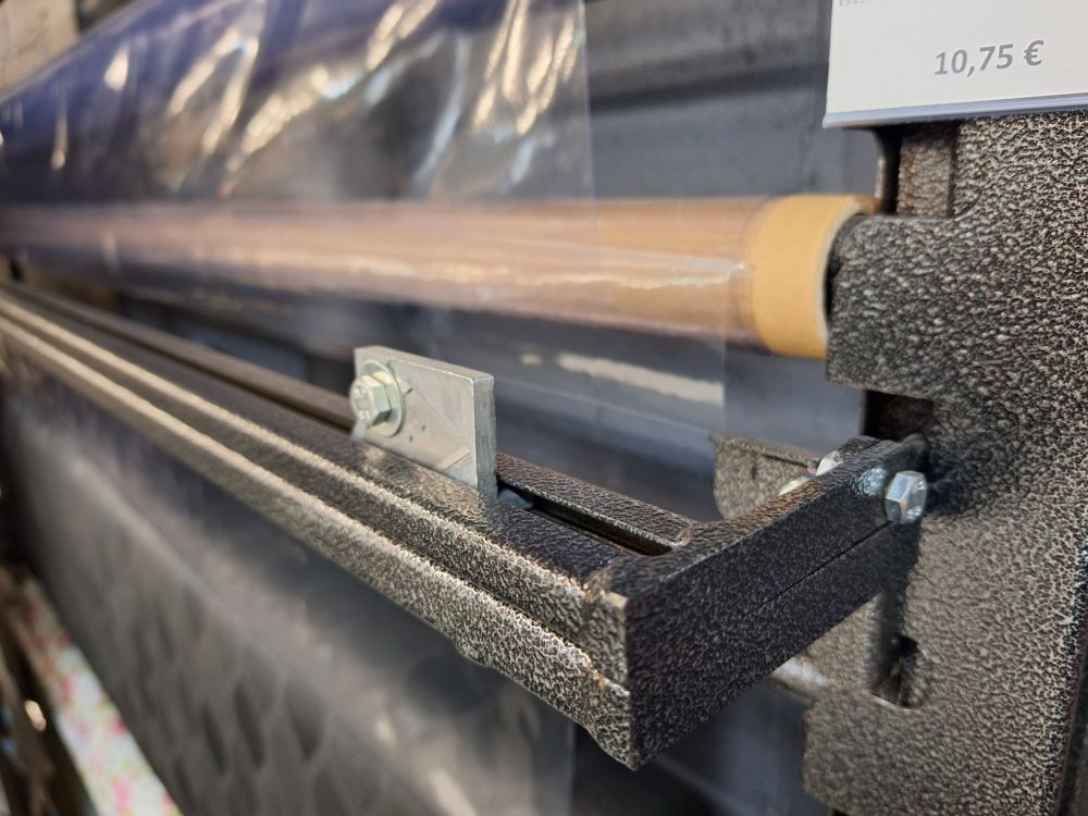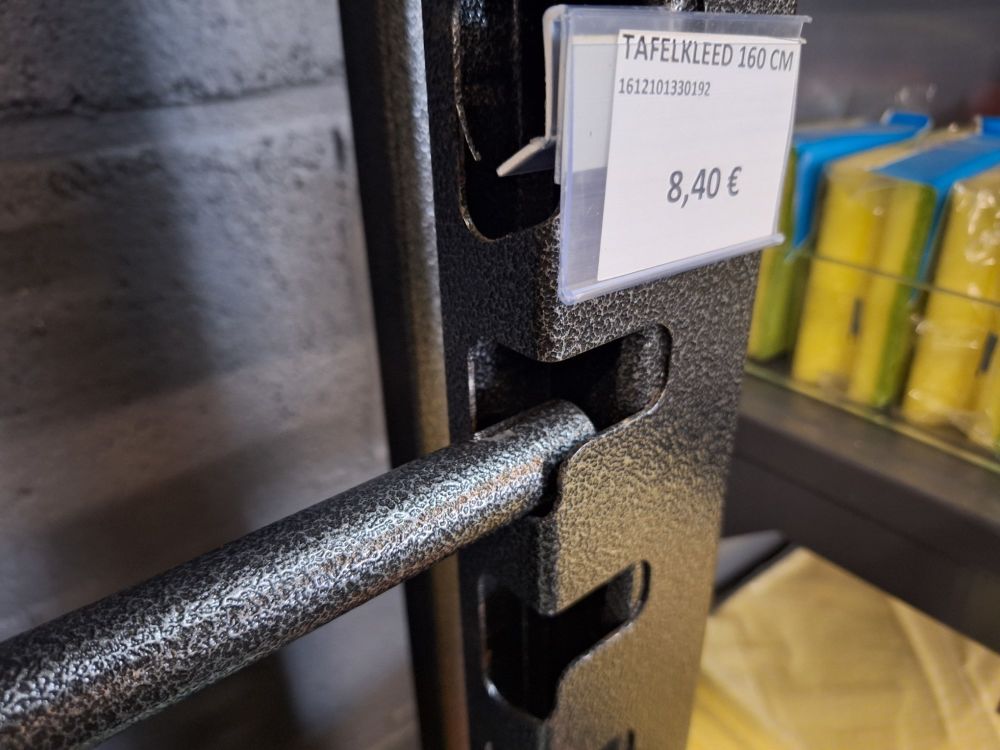 1 x zwart metalen rek met 3 verschuifbare wanden inhoud 60tal rollen diverse tafelbekleding L360xB70xH235cm