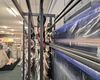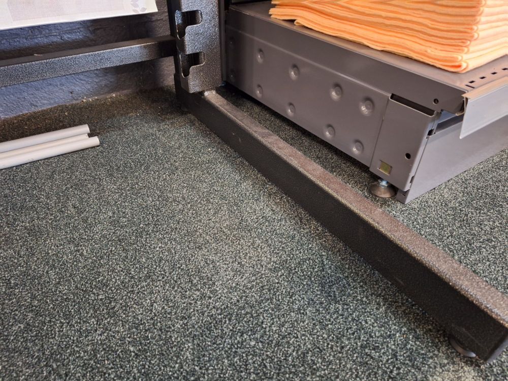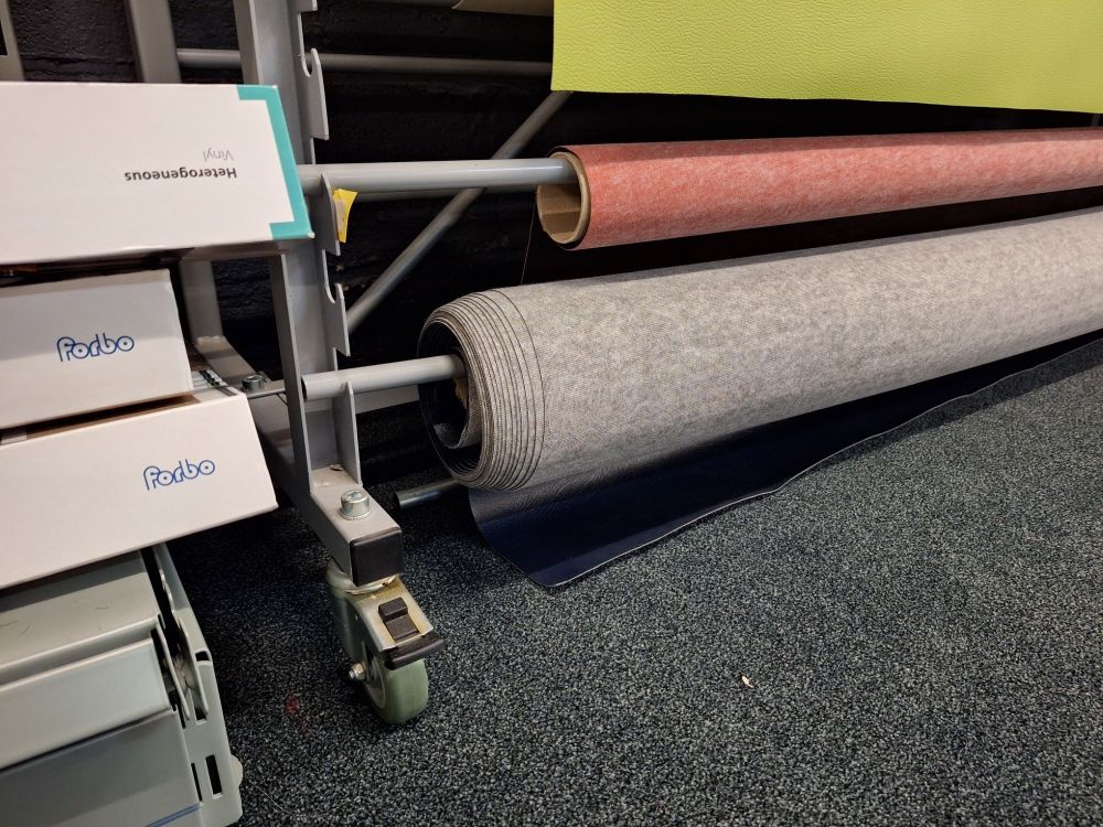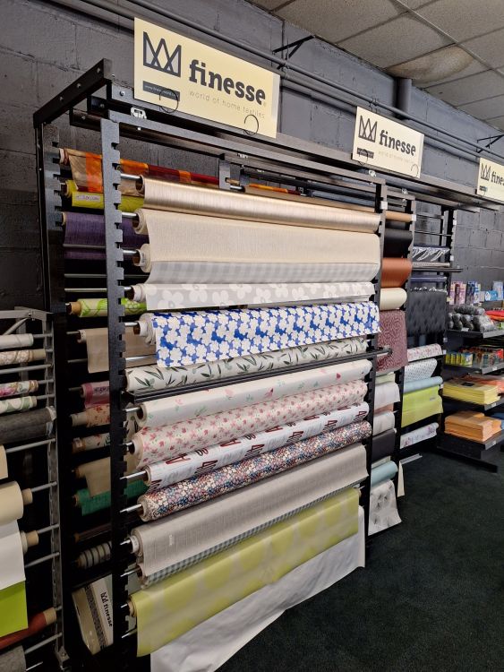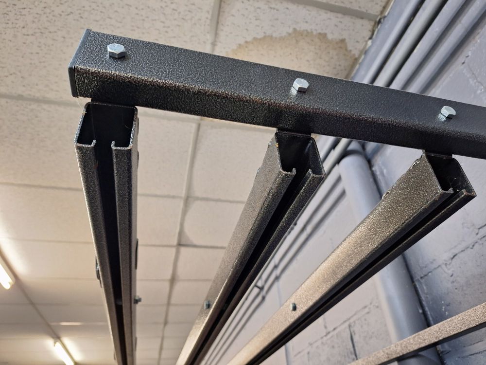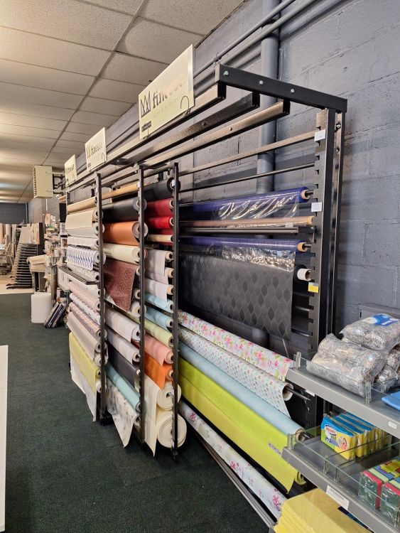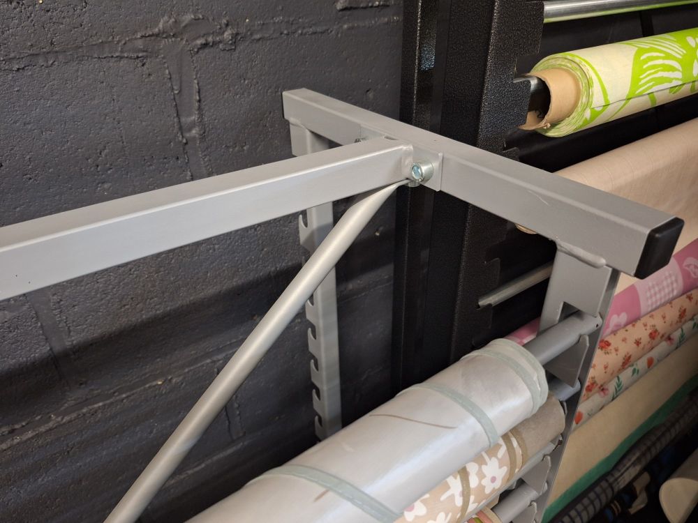 1 x zwart metalen rek met 3 verschuifbare wanden inhoud 60tal rollen diverse tafelbekleding L360xB70xH235cm