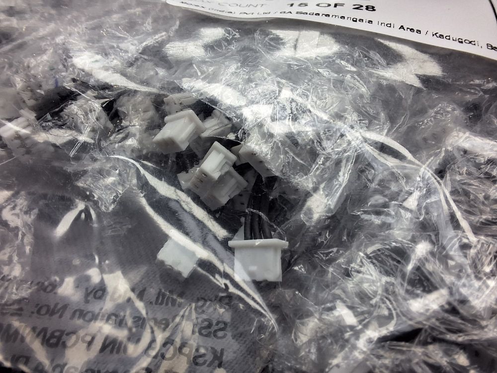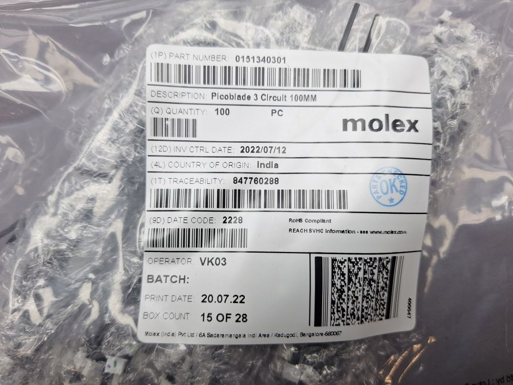 Professionele kabelassemblages van het merk Molex, type Picoblade 3 Circuit – 100 mm. Elke kabel heeft 2 witte 3-polige connectoren en is geschikt voor data- of stroomverbindingen in compacte elektronische toepassingen. Verpakt in 22 zakjes, elk met 100 stuks – Totaal: 2200 kabels Herkomst: India – RoHS-conform – met traceerbare batchinformatie