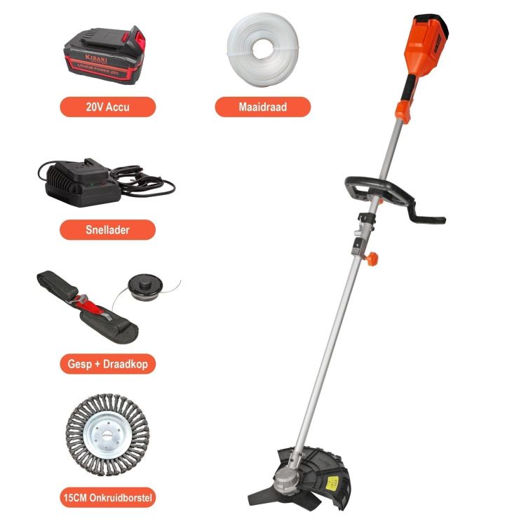 Kibani Accu Bosmaaier model 2025, Capaciteit accu: 4000 mAh, Voltage accu: 21V Snelheid motor: 5800 RPM, Maaidraad diameter: 320 mm
