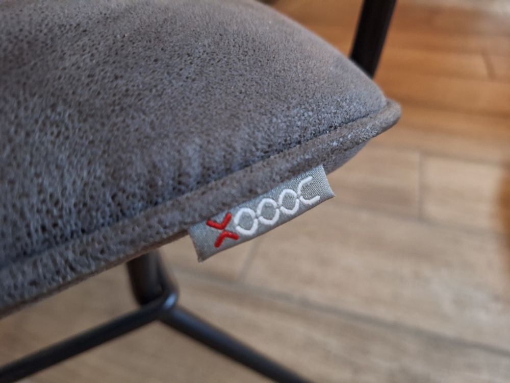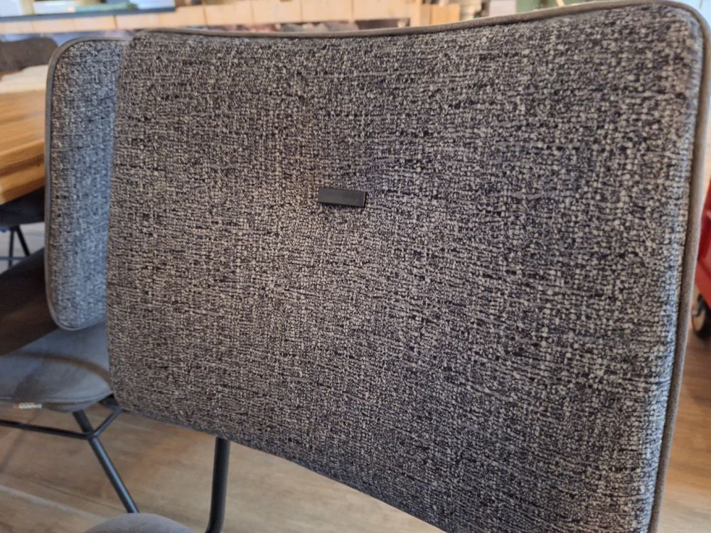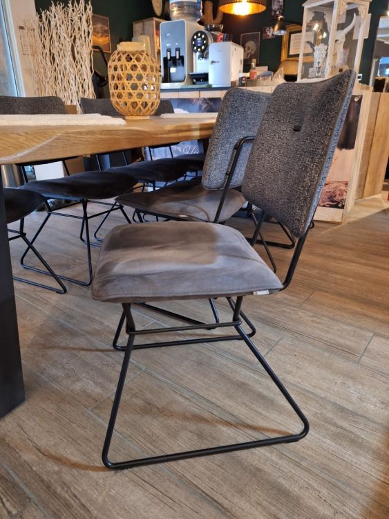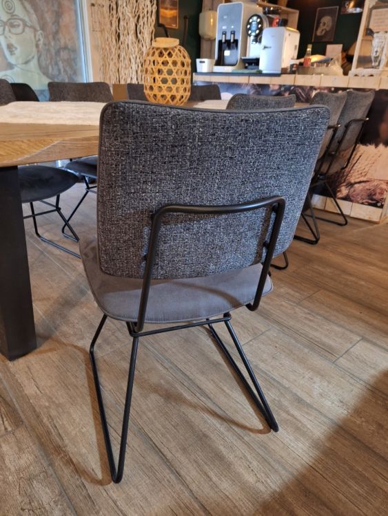 1 boomstamtafel massief van H&H afm.250x105cm met 8 grijs gestoffeerde stoelen van XOOON