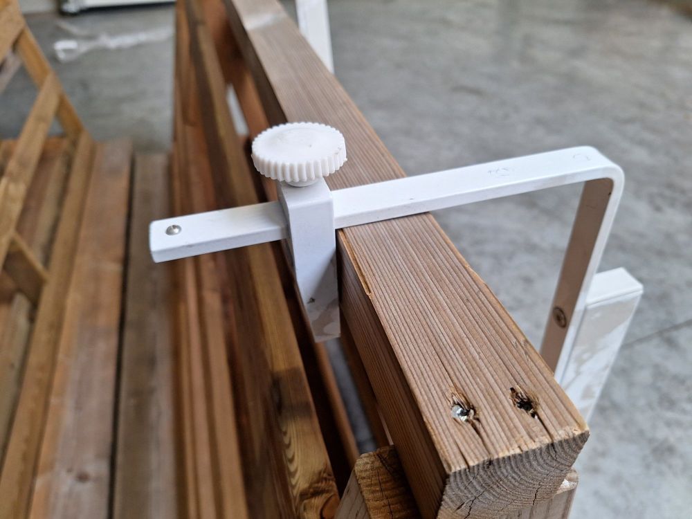 Kenmerken: Ruimtebesparend ontwerp, eenvoudig over een reling te hangen middels verstelbare klemmen. Het tafelblad is inklapbaar wanneer niet in gebruik.