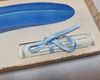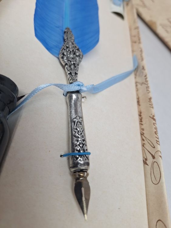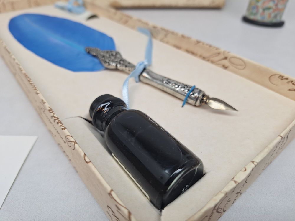 Elegante veerpen-set: blauwe struisvogelveer quill met rijk bewerkt zilveren penhouder en nib, compleet met zwart inktflesje, in nostalgische presentatie.