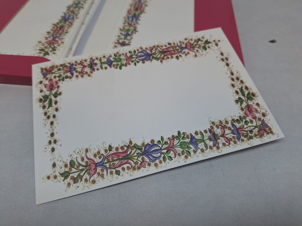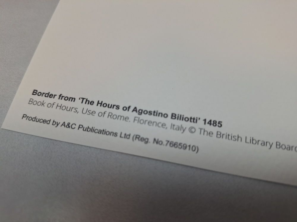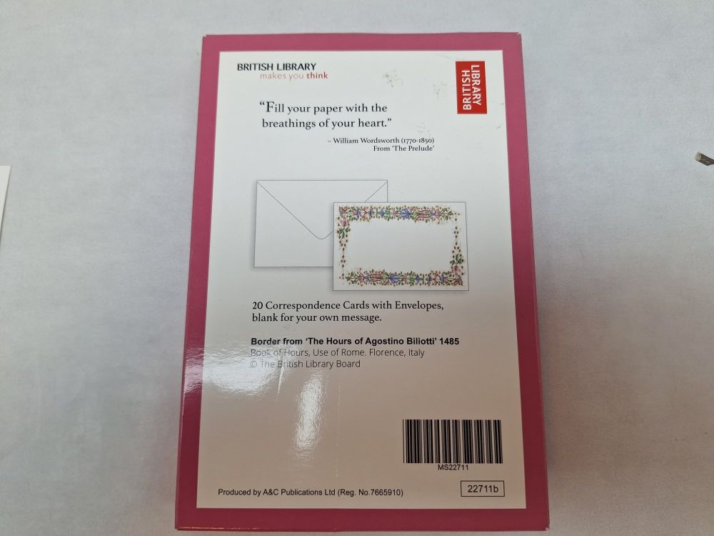 British Library "Correspondence Cards" (20 blanco kaarten met bijpassende enveloppen), met sierlijke florale randen geïnspireerd op de illuminaties uit "The Hours of Agostino Biliotti" (Boek der Uren, Florence 1485).