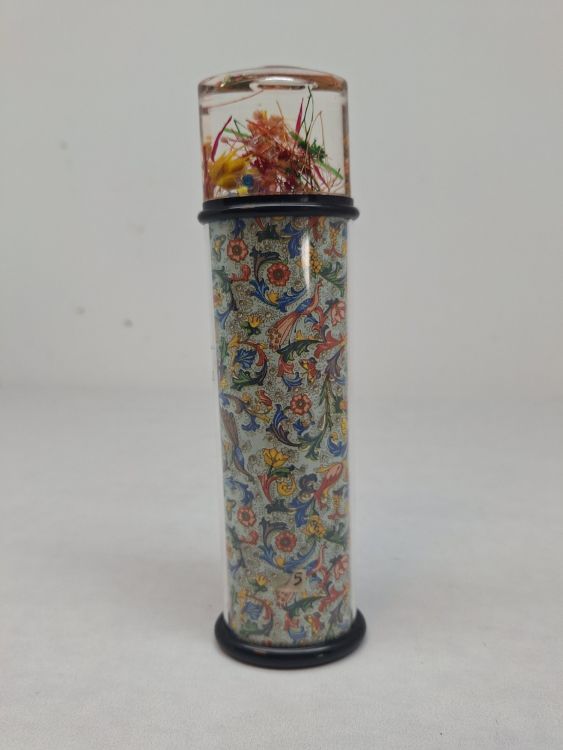 Luxe olie-kaleidoscoop met klassiek William Morris "Strawberry Thief"-patroon (vogels en bloemen in rood, blauw, groen en geel), gevuld met kleurrijke zwevende elementen in vloeistof voor steeds veranderende patronen.