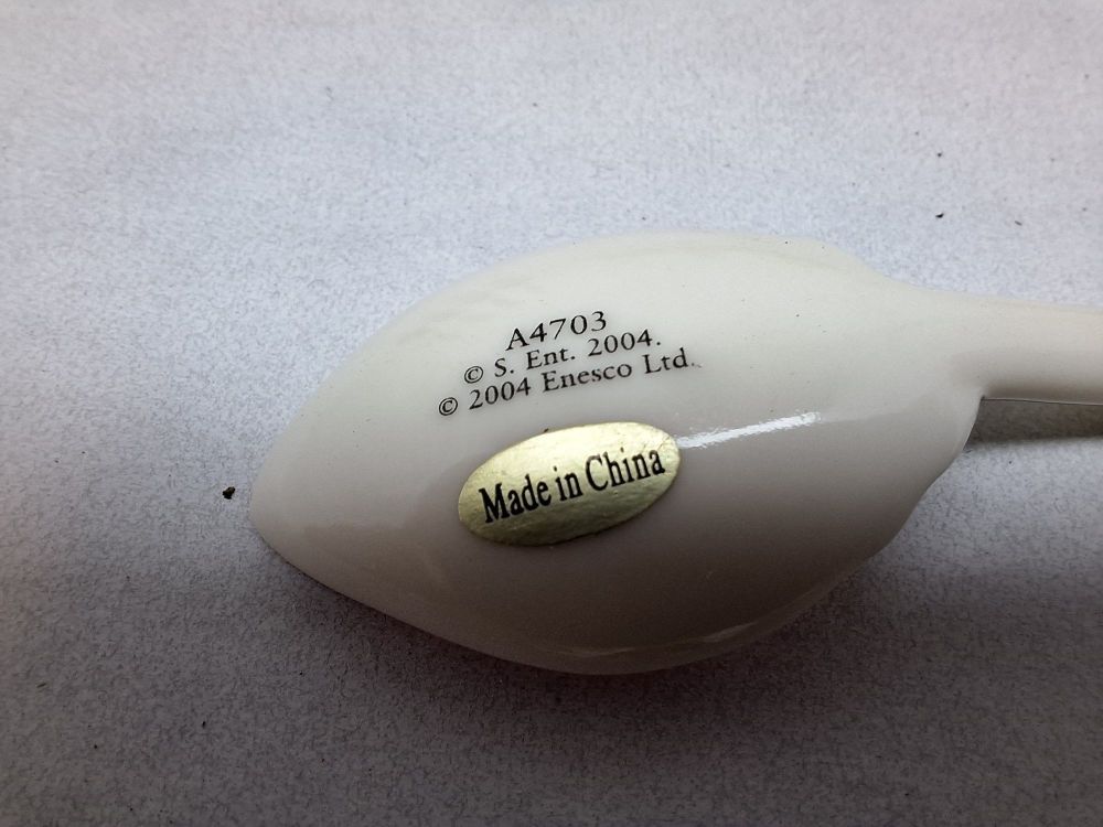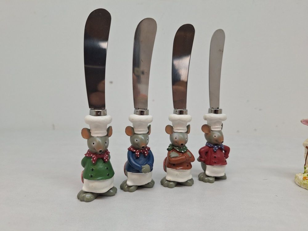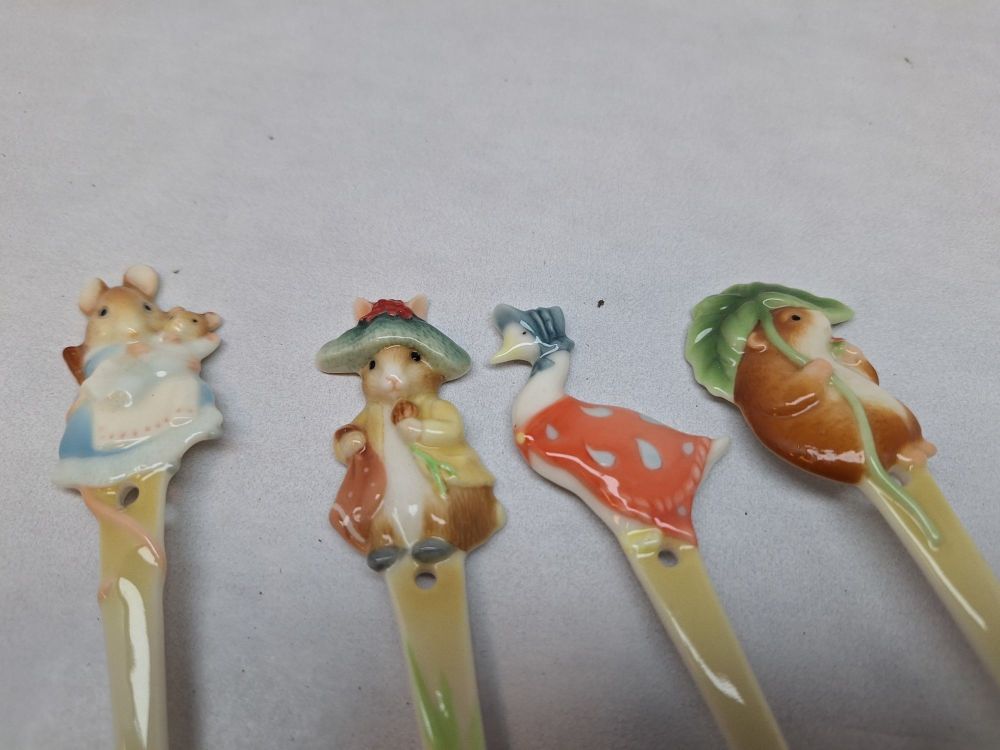 4 keramische lepels met figuren (muizen, vogels, konijnen) | Merk / Herkomst | Enesco Ltd. – gemerkt “© 2004 Enesco Ltd.”