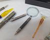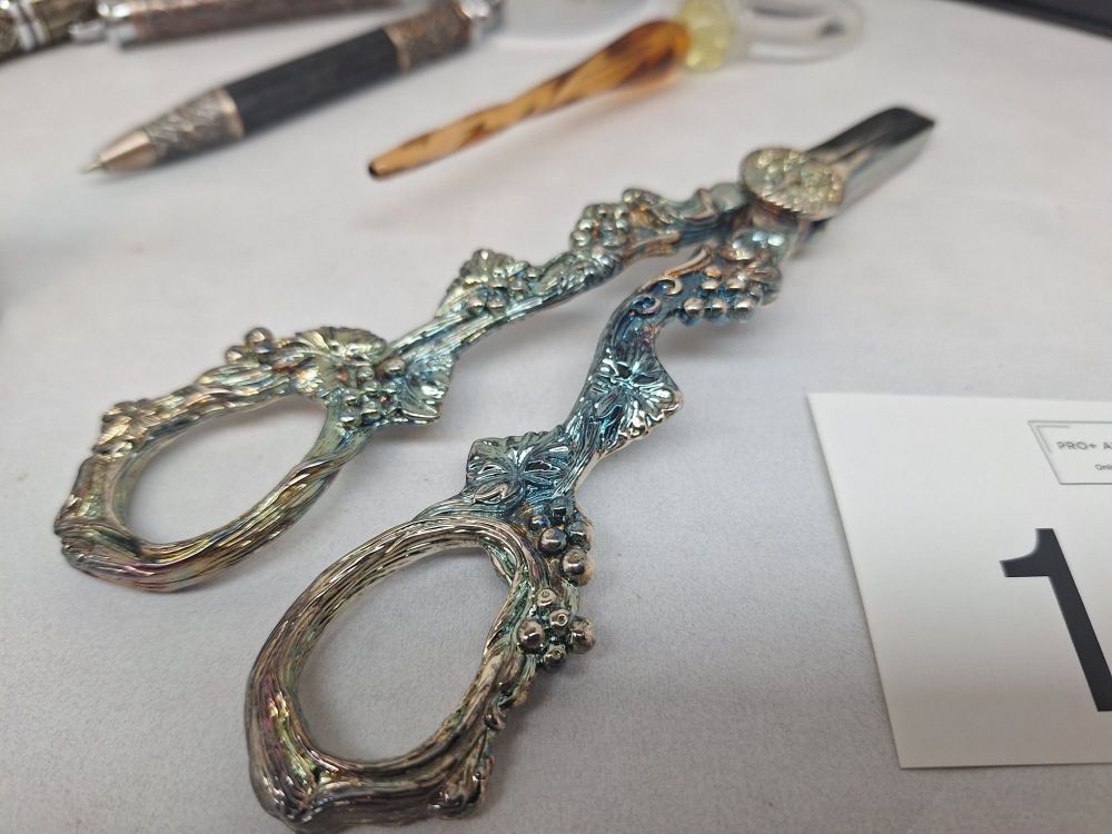 | Bureau Accessoires | Grote loep (vergrootglas) met metalen handvat, 2x kleine loepen/glazen pennen, decoratieve druivenscharen. |
