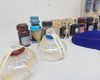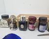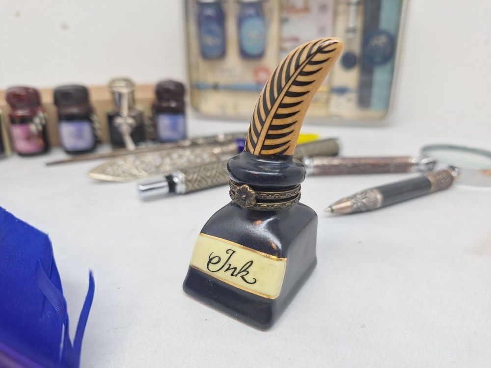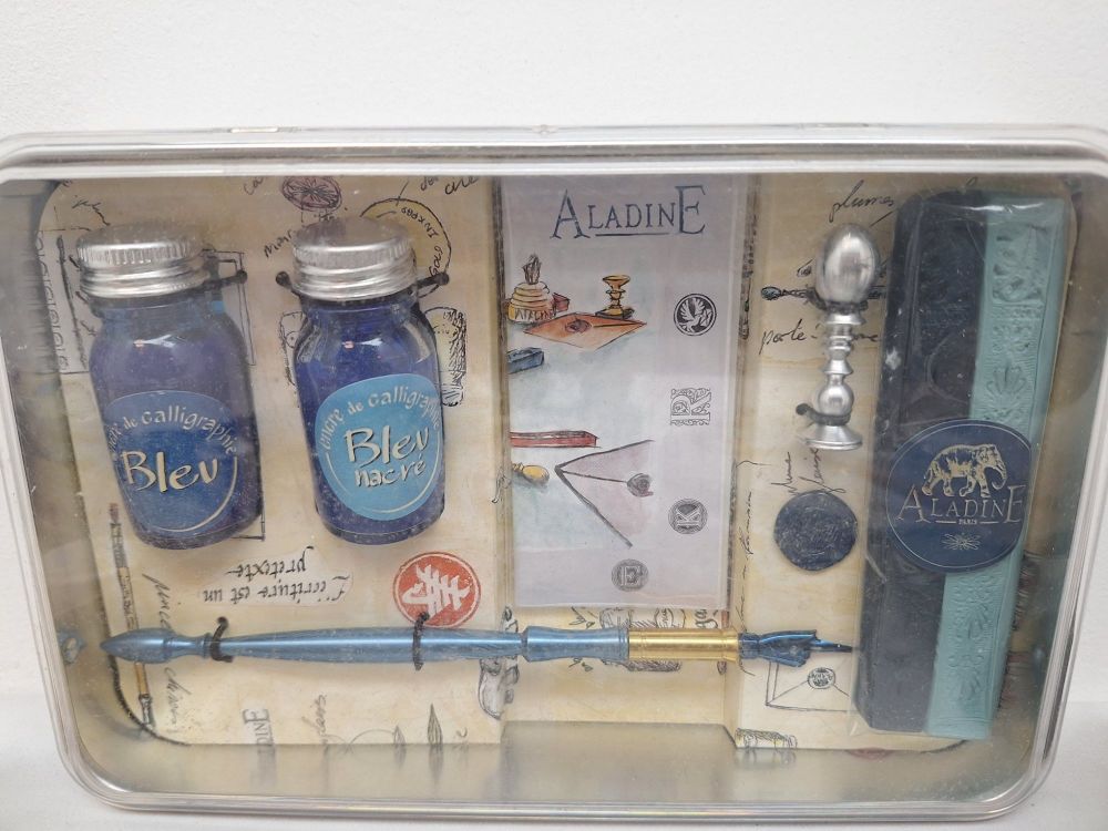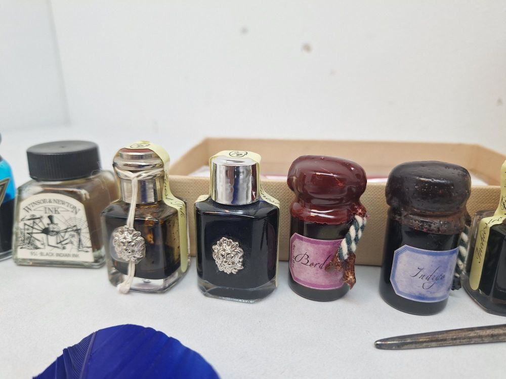 | Inkt/Inktpotten | Flessen/potten: 2x Aladine blauwe kalligrafie-inkt, 1x Winsor & Newton Black Indian Ink, 2x Original Murano glazen inktpotten, en diverse Bortoletti/Indigo/Berlini inktflesjes. |